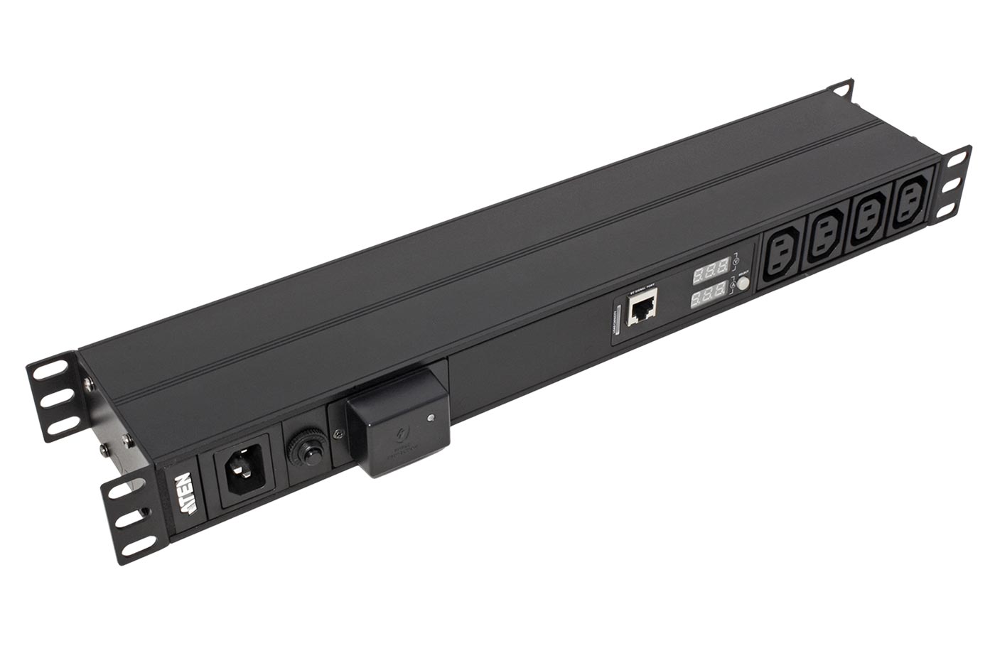 Jednofázový napájecí panel s 18 zásuvkami C13. 4 zásuvky jsou na přední straně panelu, zbytek na zadní straně. S měřením napětí a proudu.