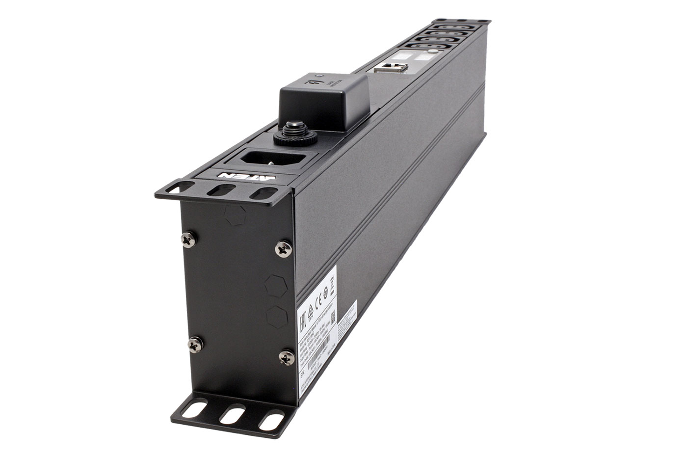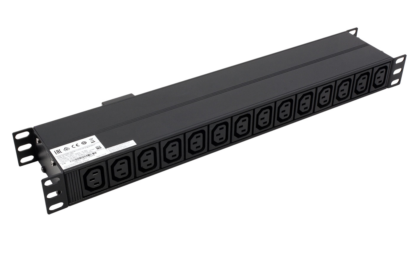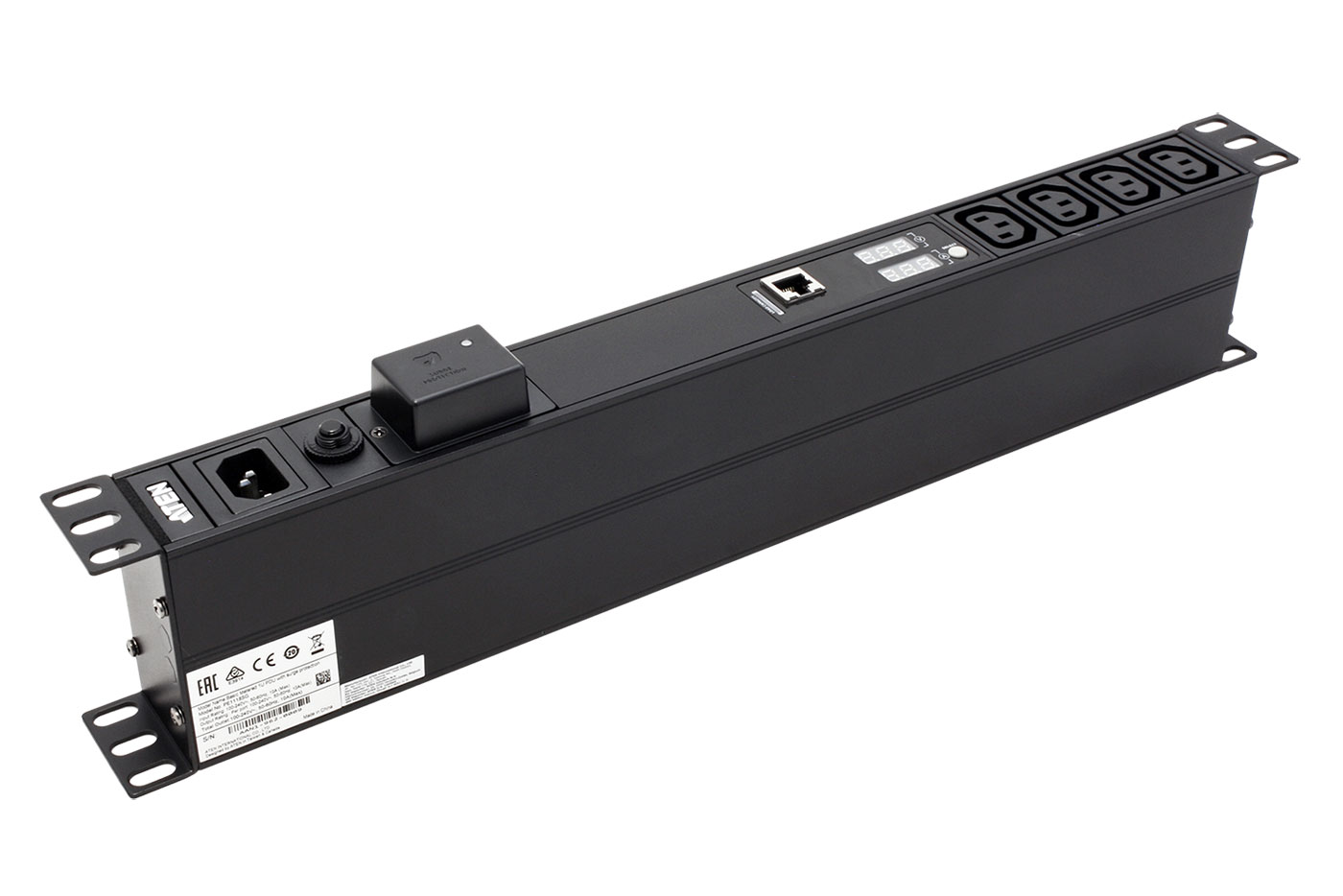 Jednofázový napájecí panel s 18 zásuvkami C13. 4 zásuvky jsou na přední straně panelu, zbytek na zadní straně. S měřením napětí a proudu.;
