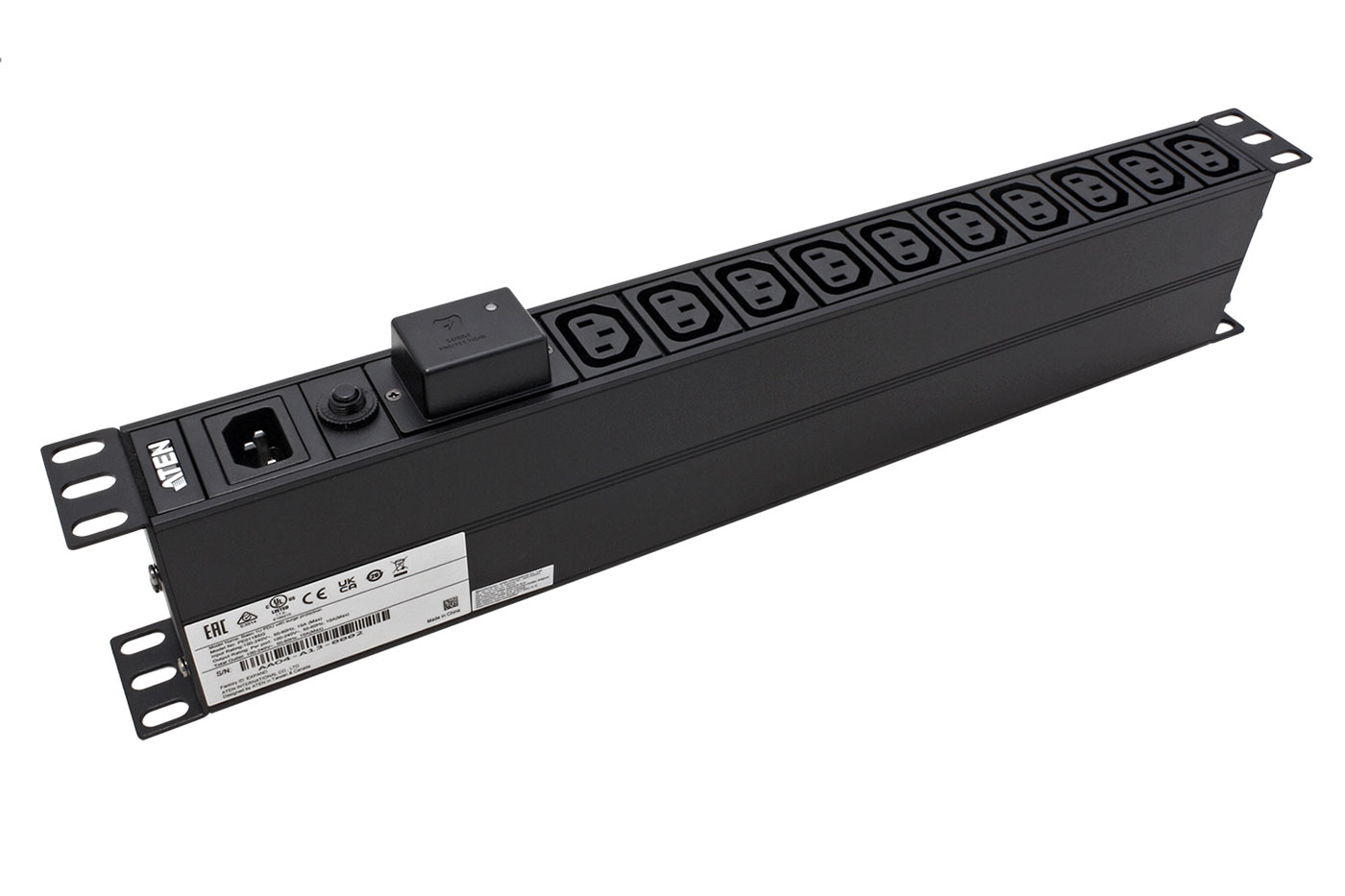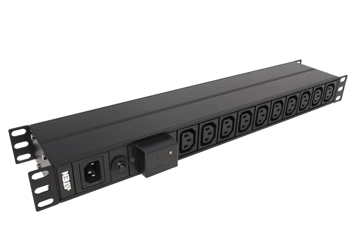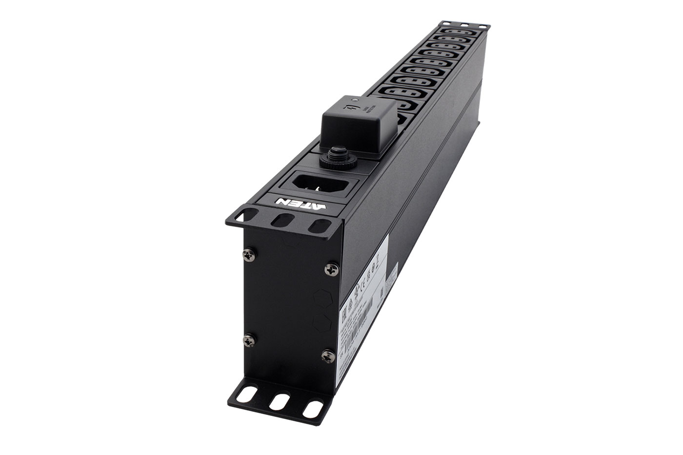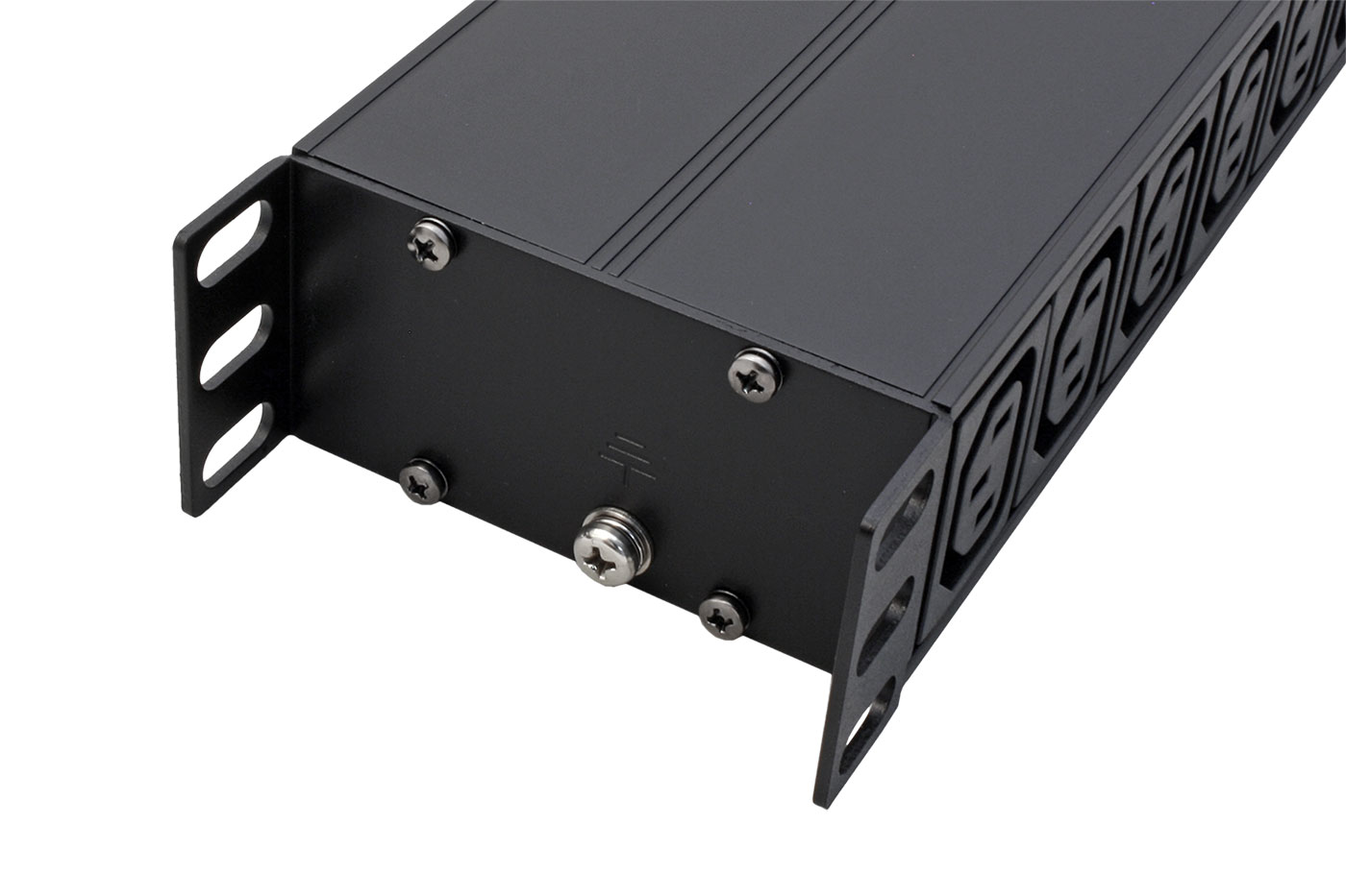 Jednofázový napájecí panel s 18 zásuvkami C13. 10 zásuvek je na přední straně panelu, zbytek na zadní straně.