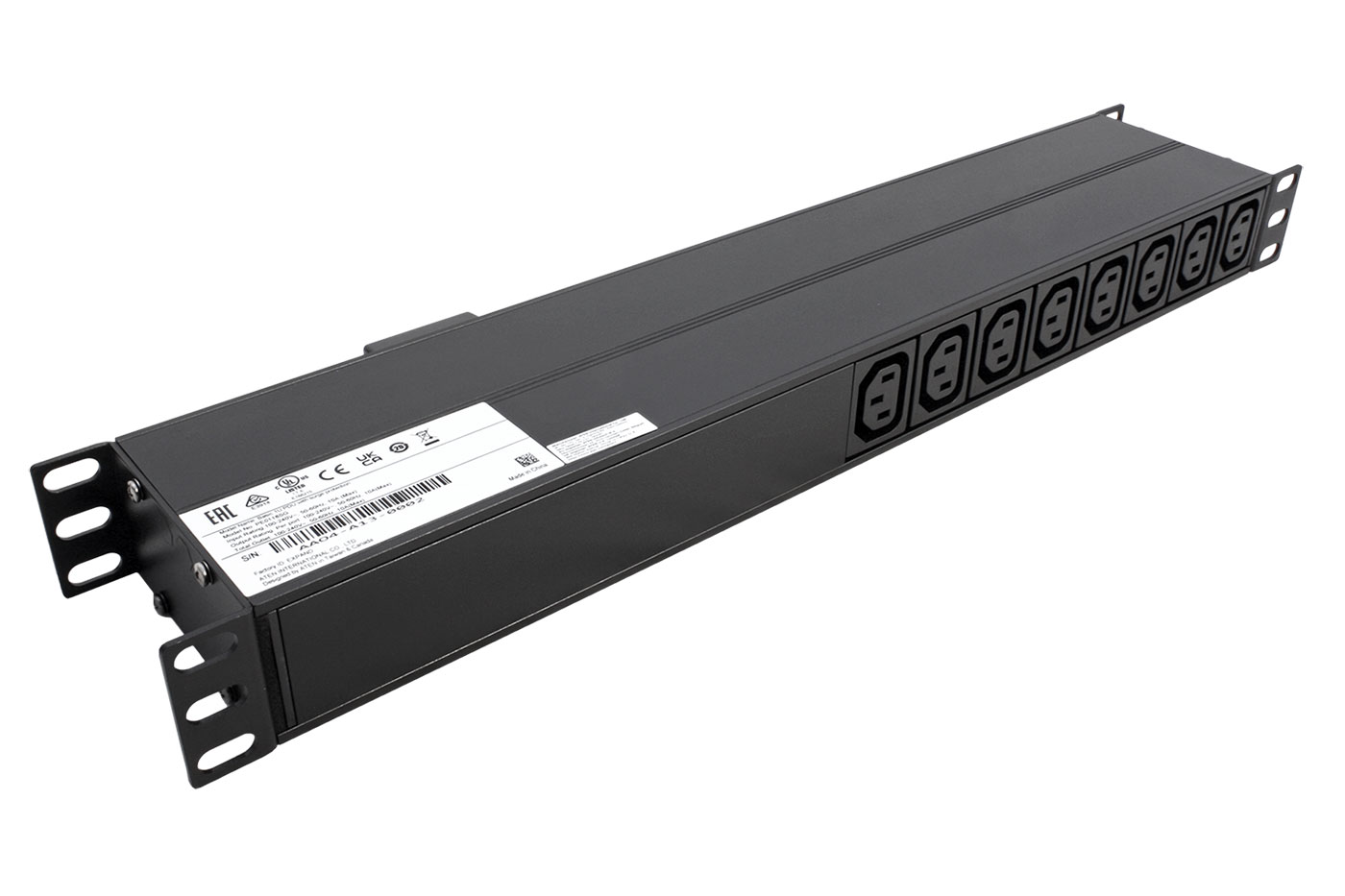 Jednofázový napájecí panel s 18 zásuvkami C13. 10 zásuvek je na přední straně panelu, zbytek na zadní straně.;