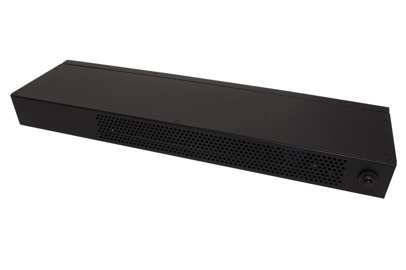 19" napájecí panel s 8 přístrojovými zásuvkami samostatně ovládanými přes IP. S měřením napětí, proudu, teploty a vlhkosti.