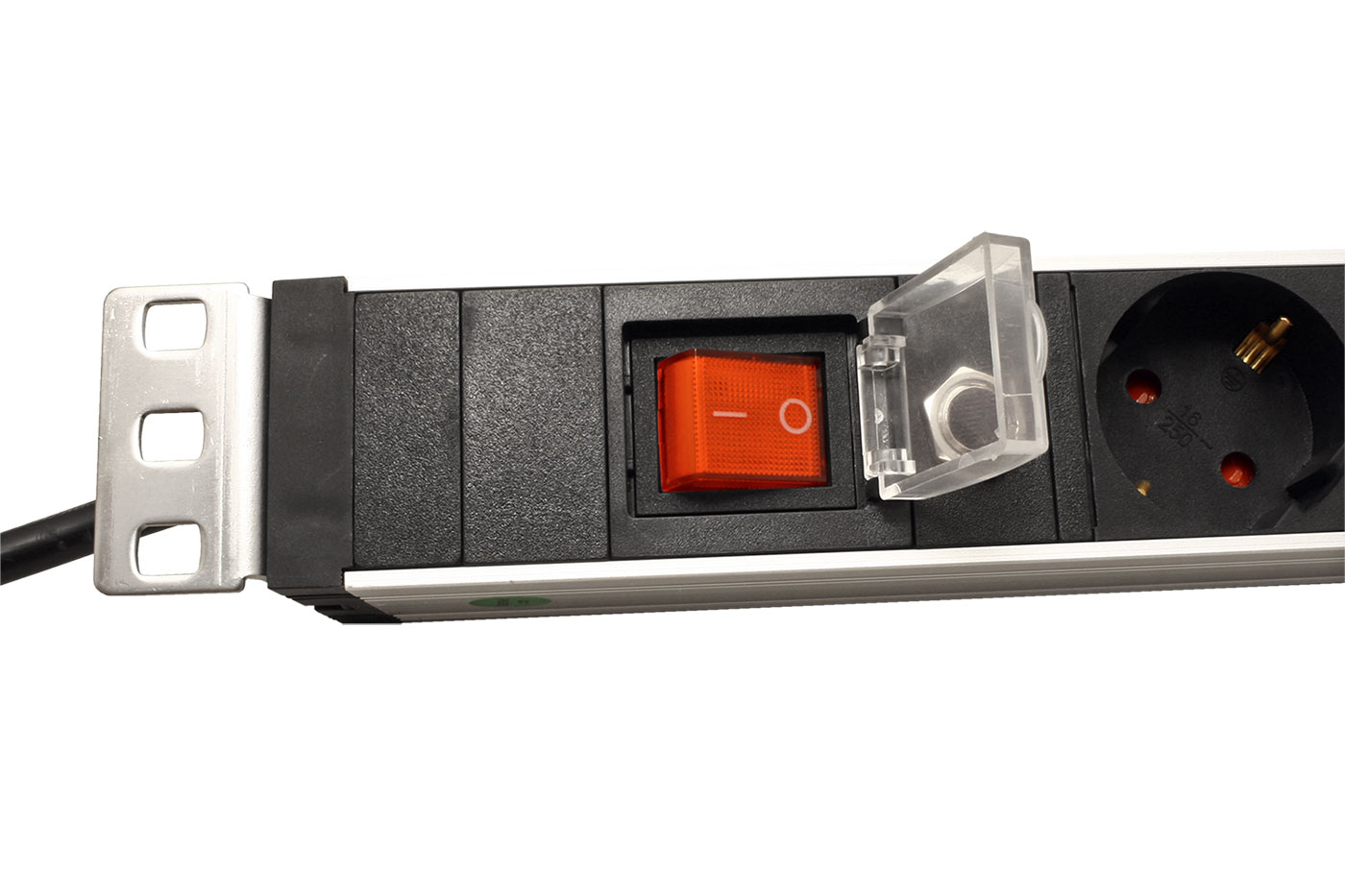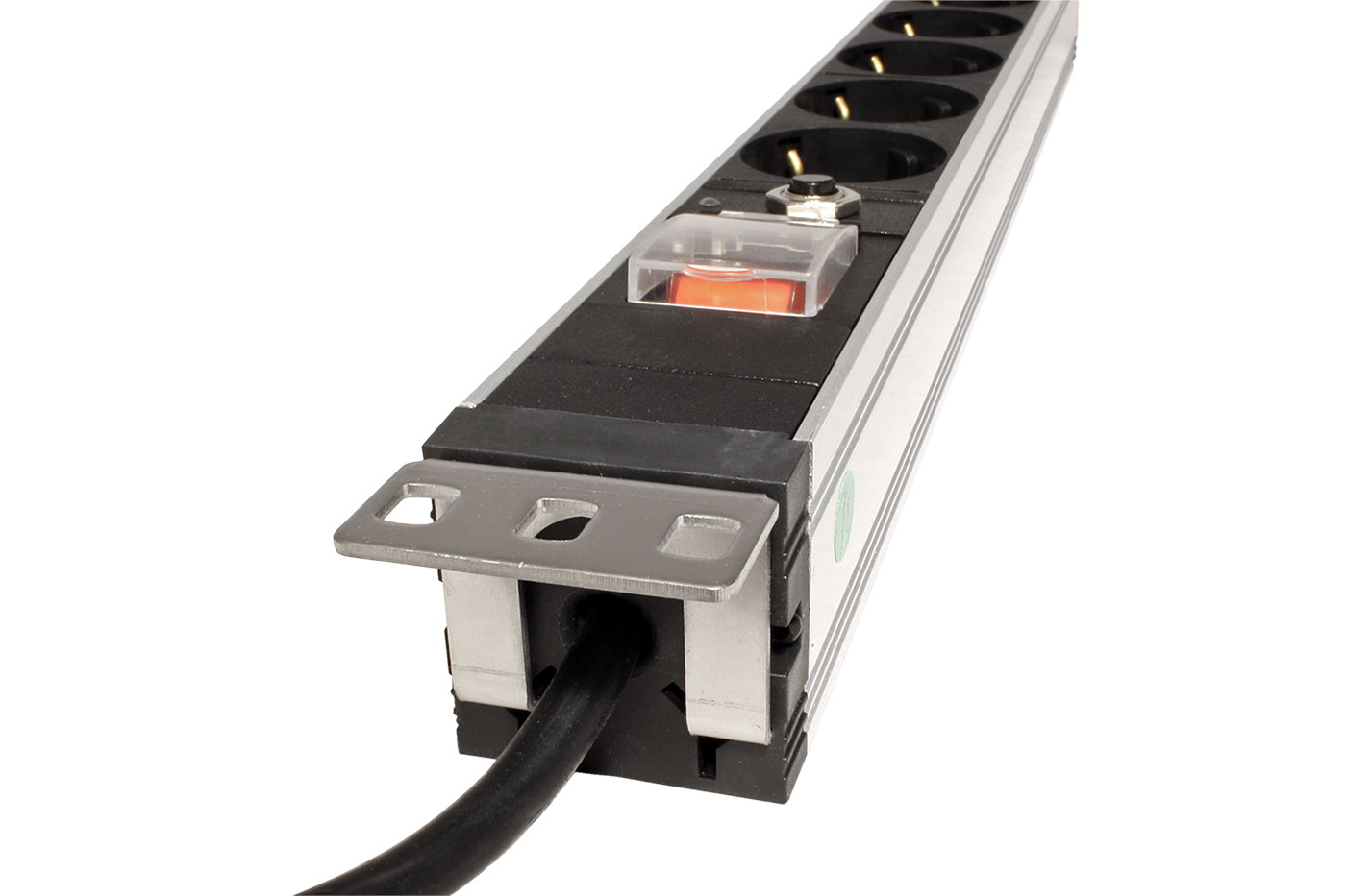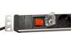 Sedminásobná zásuvka (DE) s přepěťovou ochranou a vypínačem, pro montáž do rozvaděče (výška 1U).
