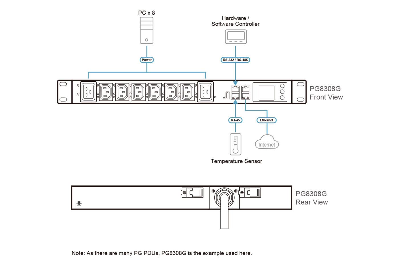 - Dva ethernetové porty podporují kaskádové připojení až 64 PDU