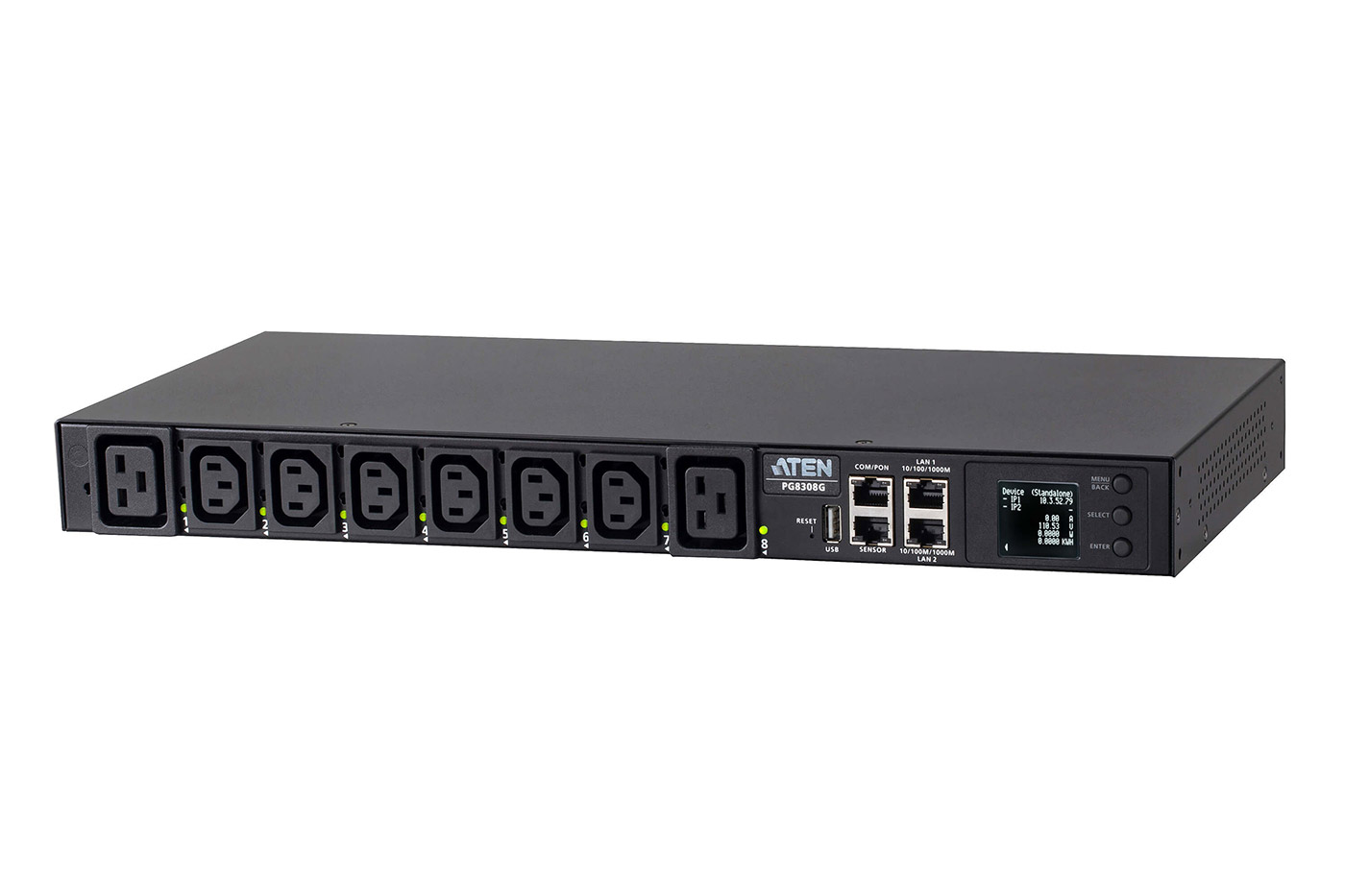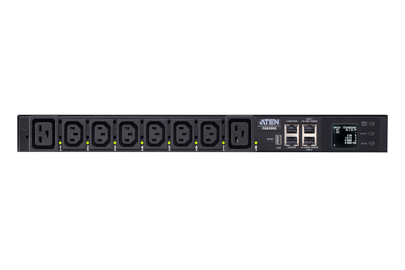 19" napájecí panel s 8 přístrojovými zásuvkami (6x IEC320 C13 + 2x C19) přes IP. Měření elektrických veličin a ovládání zásuvek po jednotlivých výstupech.