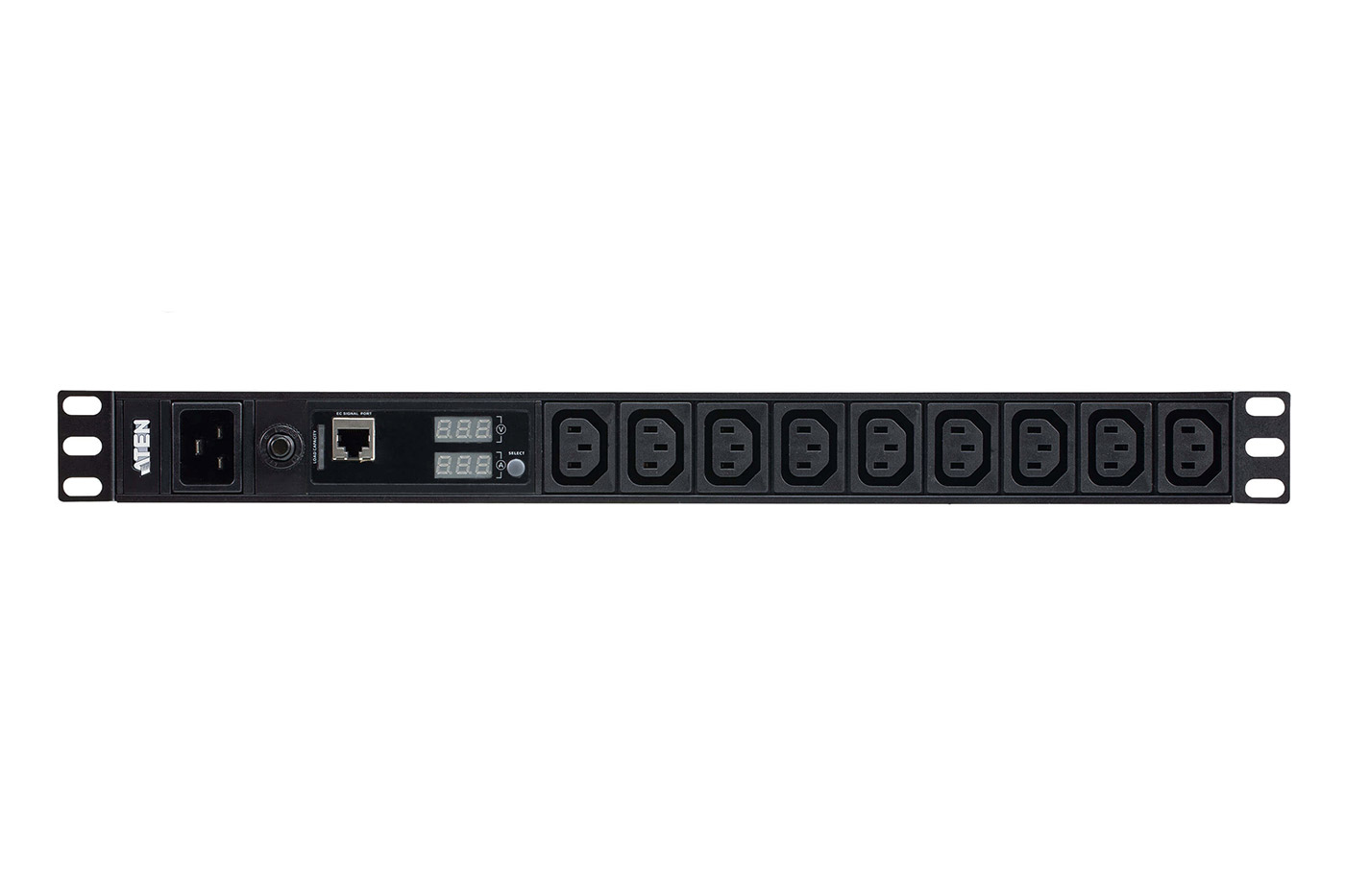 Jednofázový napájecí panel s 9 zásuvkami C13. S měřením napětí a proudu.