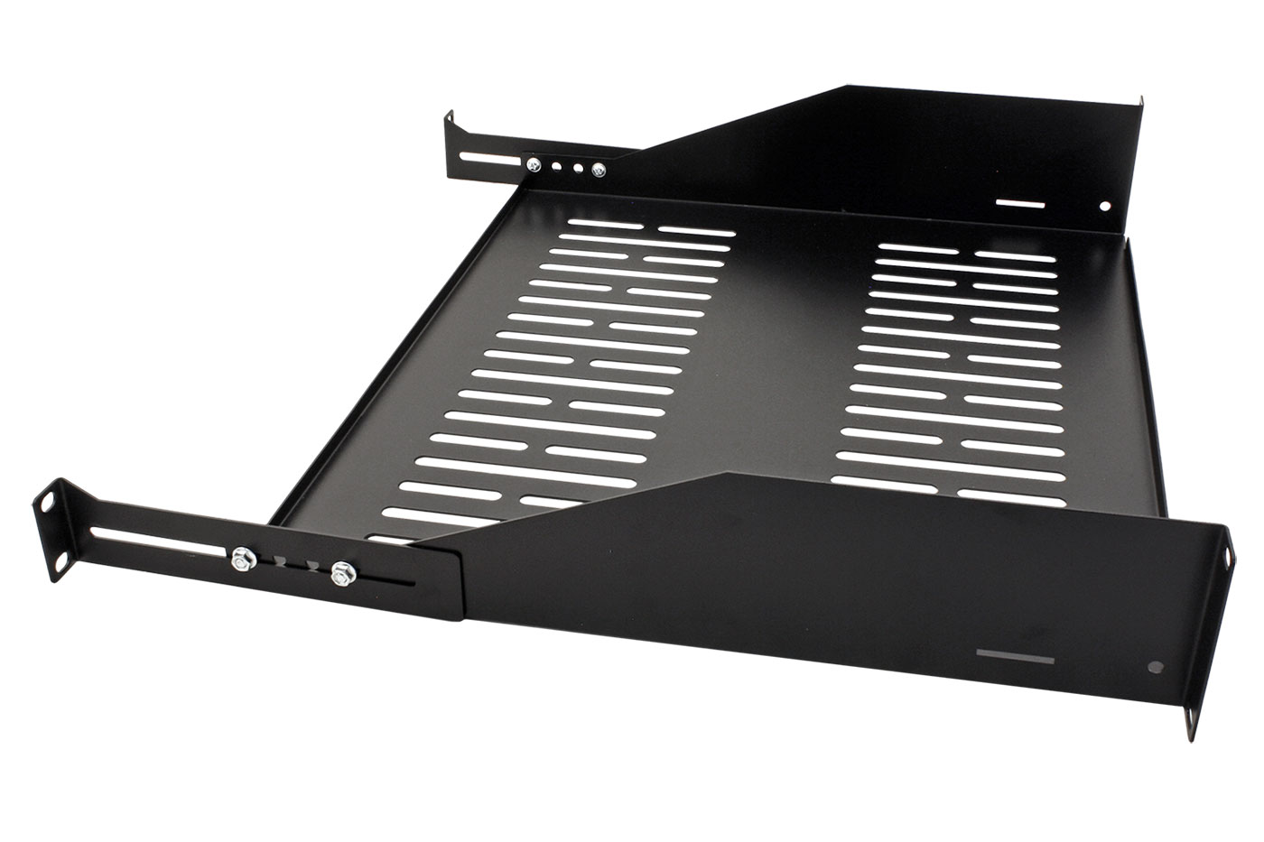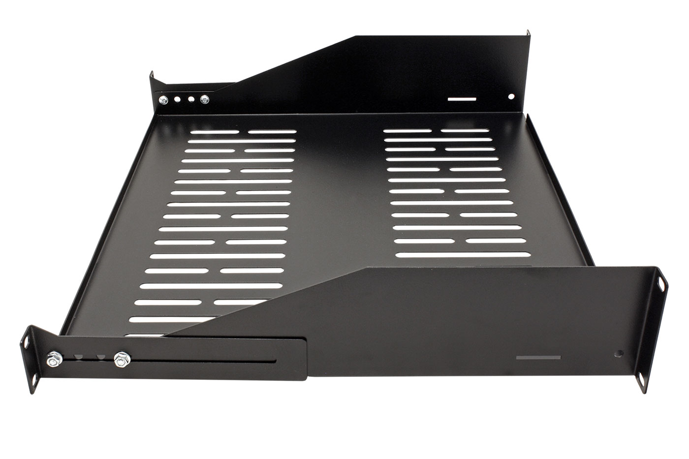 19" 2U pevná police hluboká 400mm s uchycením vpředu a vzadu.