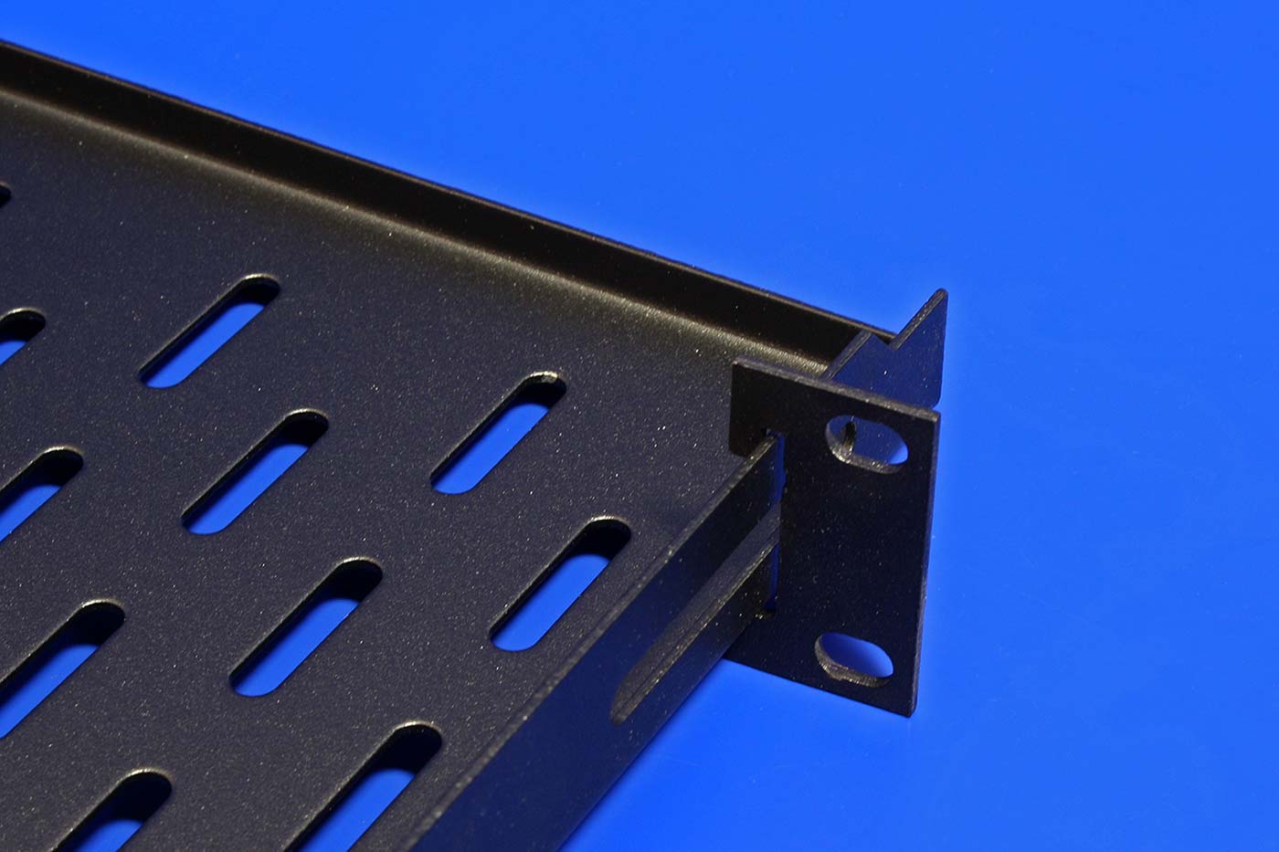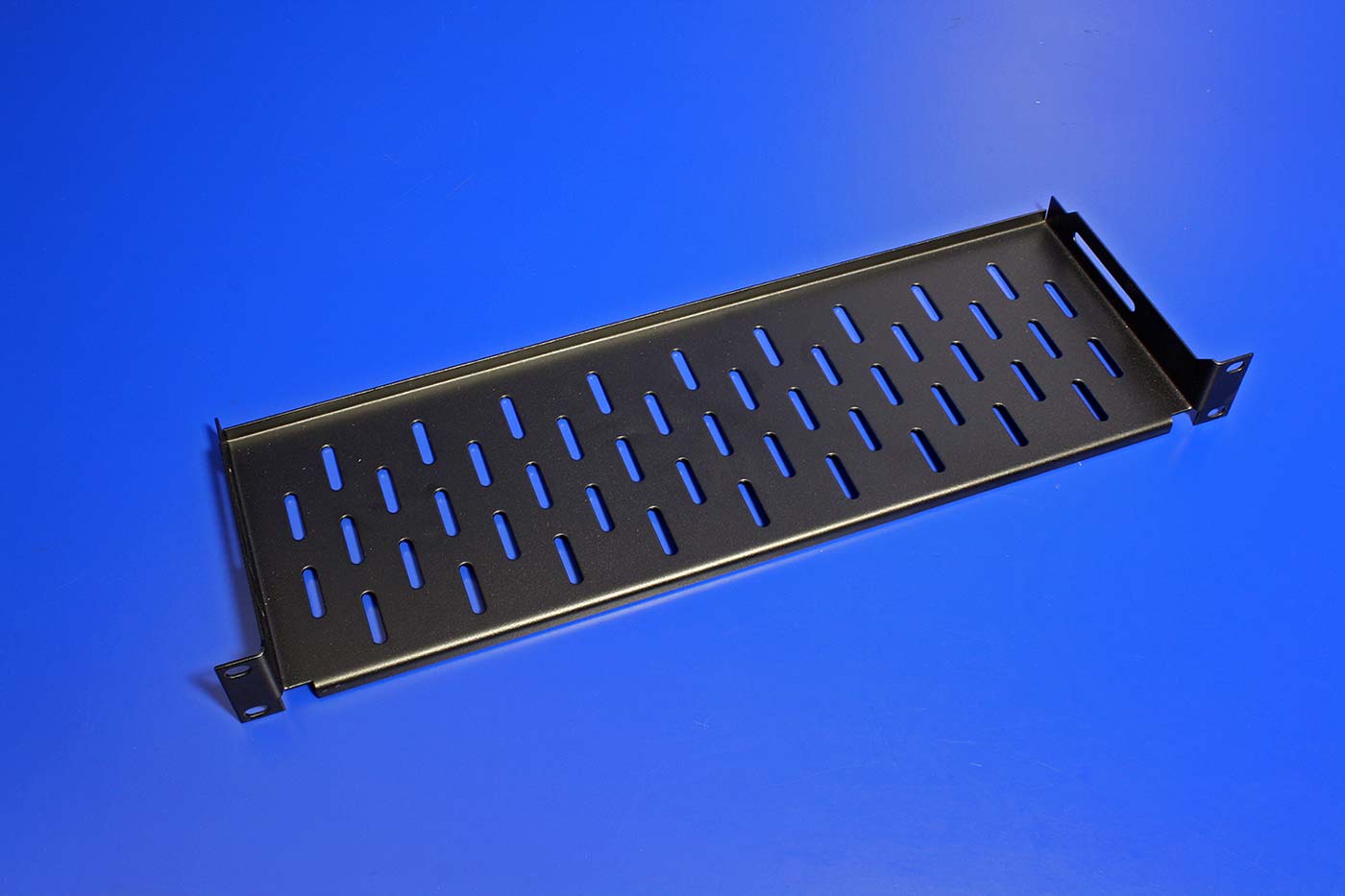 19" 1U pevná police hluboká 150mm s uchycením vpředu.