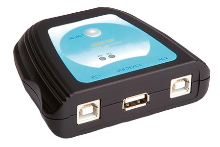 USB 2.0 přepínač umožňující 2 počítačům sdílet jedno zařízení.