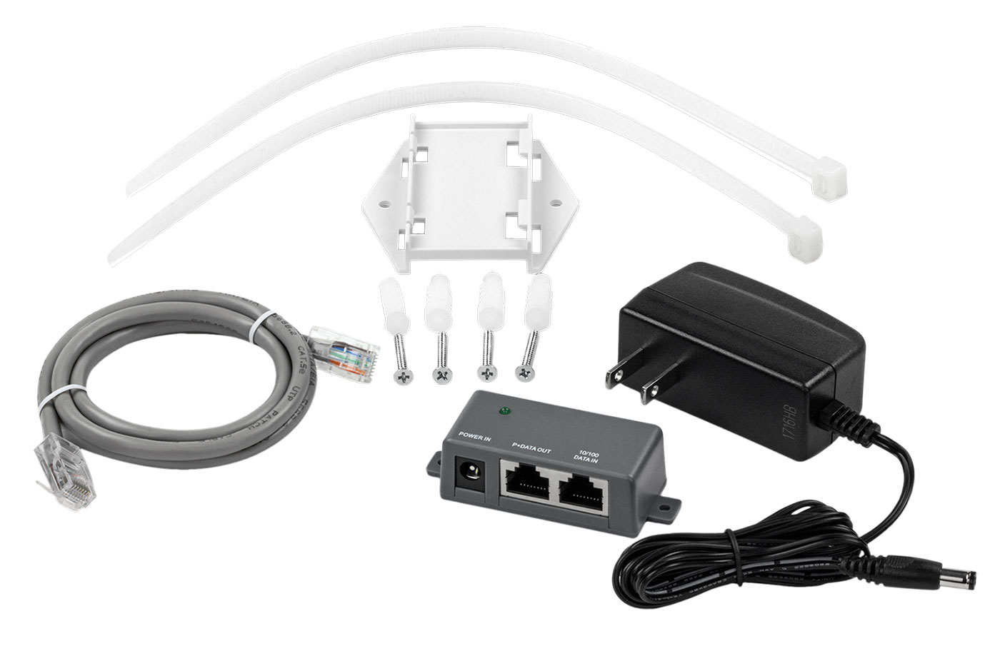 Obsah balení: venkovní jednotka, zdroj 24VDC/1A s pasivním POE splittrem (2x RJ45F), vázací pásek pro připevnění jednotky, zemnící drát;