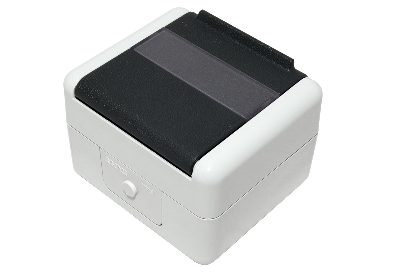Krabice s krytím IP44 pro osazení jednoho Keystone modulu. Odklopný kryt s pružinou zajišťuje automatické zakrytí nezapojené zásuvky.