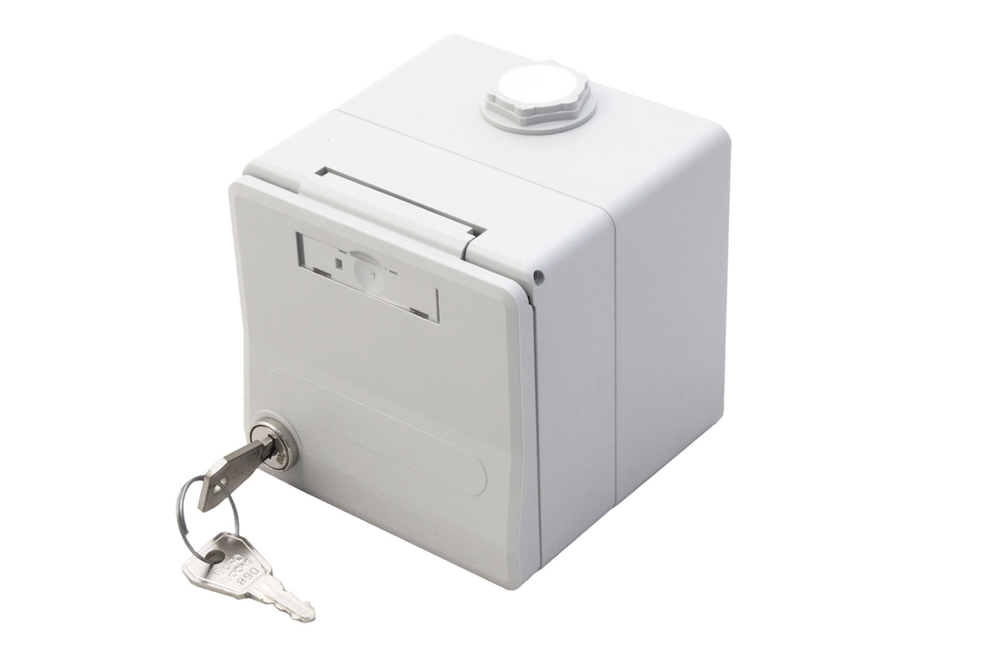Zásuvka na omítku s krytem a zámkem pro 2x Keystone modul.