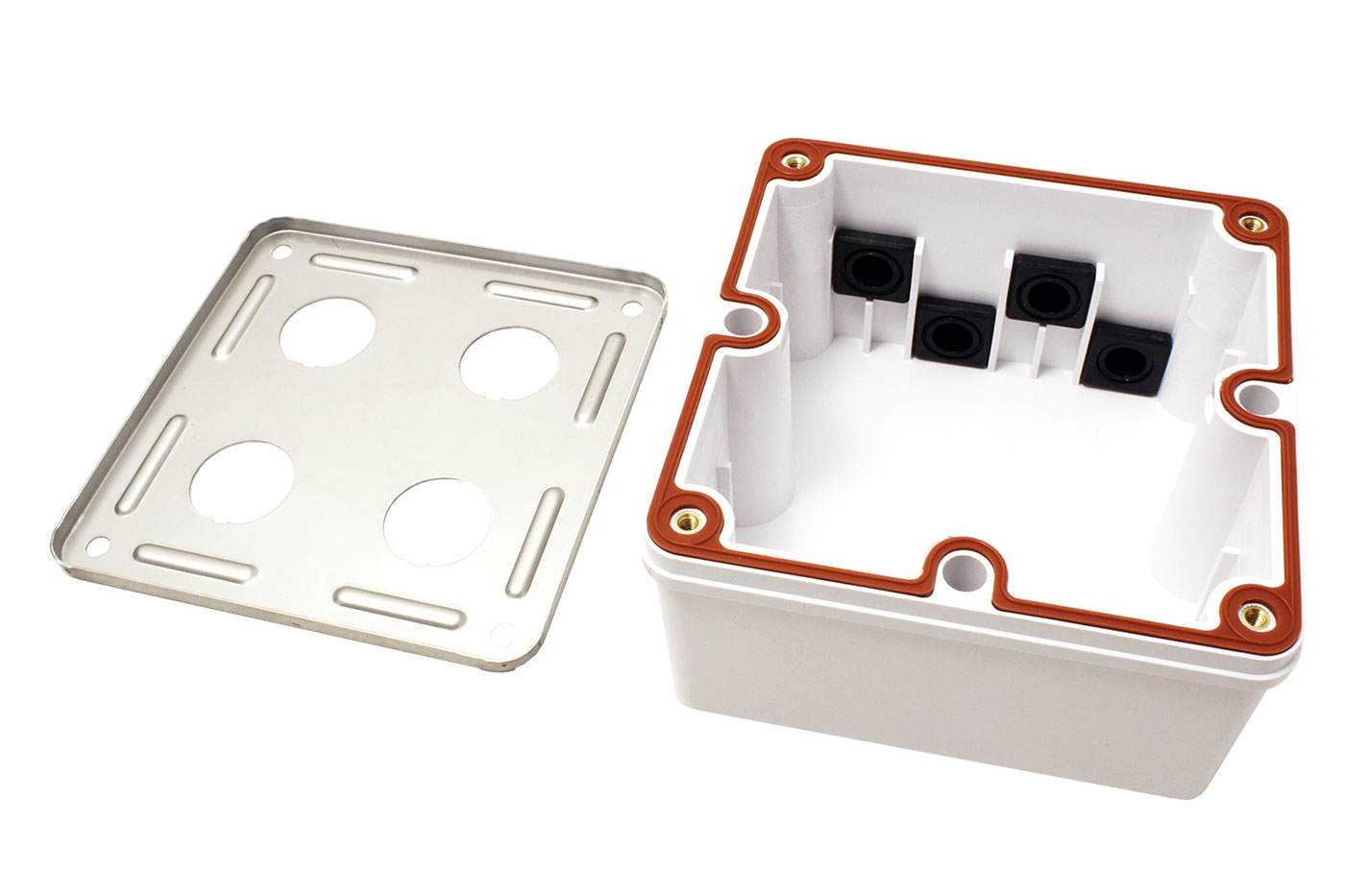 Obsah balení: box (krabička + čelo), 4x PG průchodka průměr 16mm, 3x zátka do průchodky, 4 nerez šrouby, 3 nerez vruty;