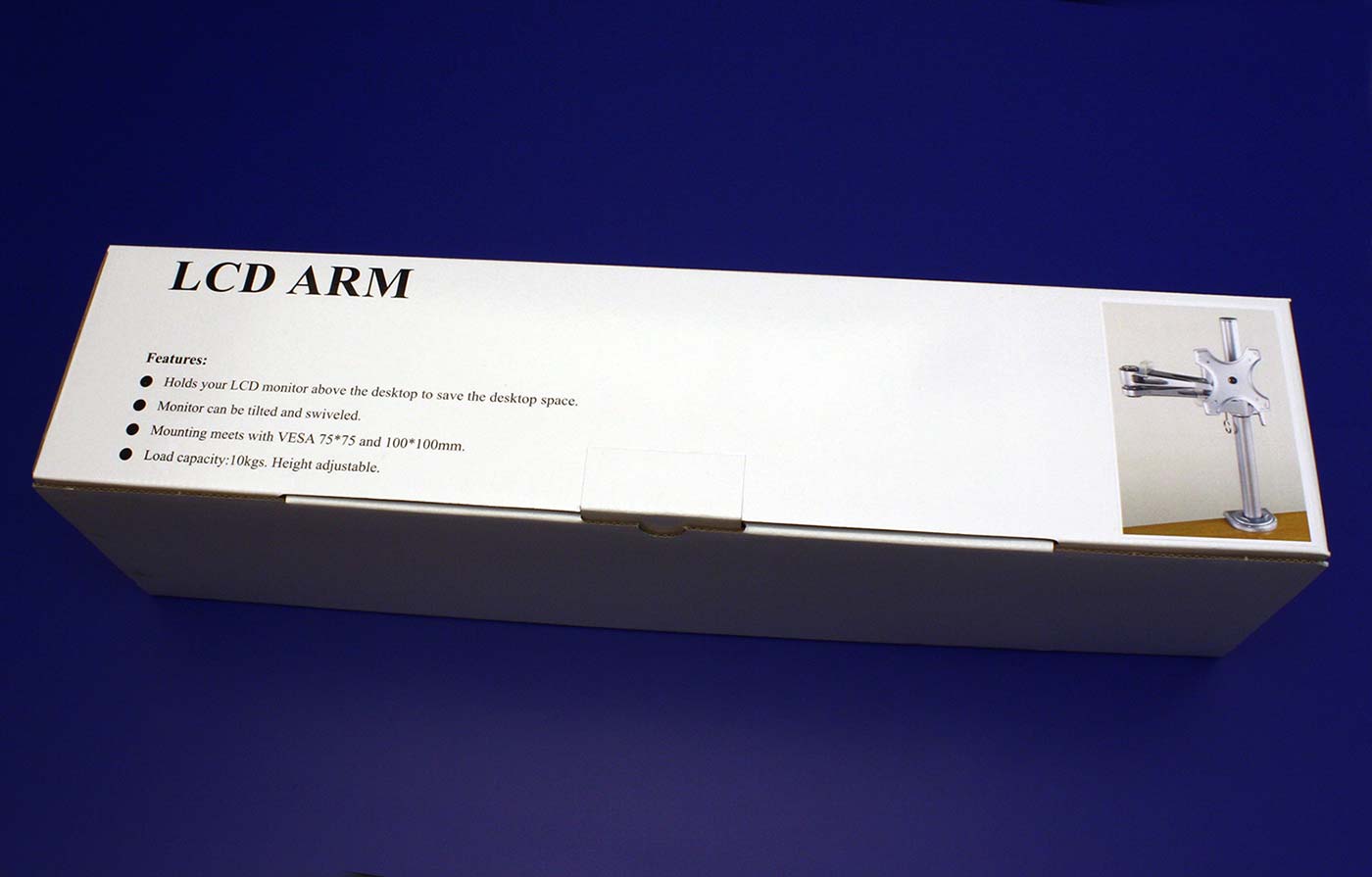 Obsah balení: rameno, nosná tyč, 4x šrouby pro VESA, plastová krytka na tyč, klíč pro nastavení kloubů, vodítka na kabeláž;