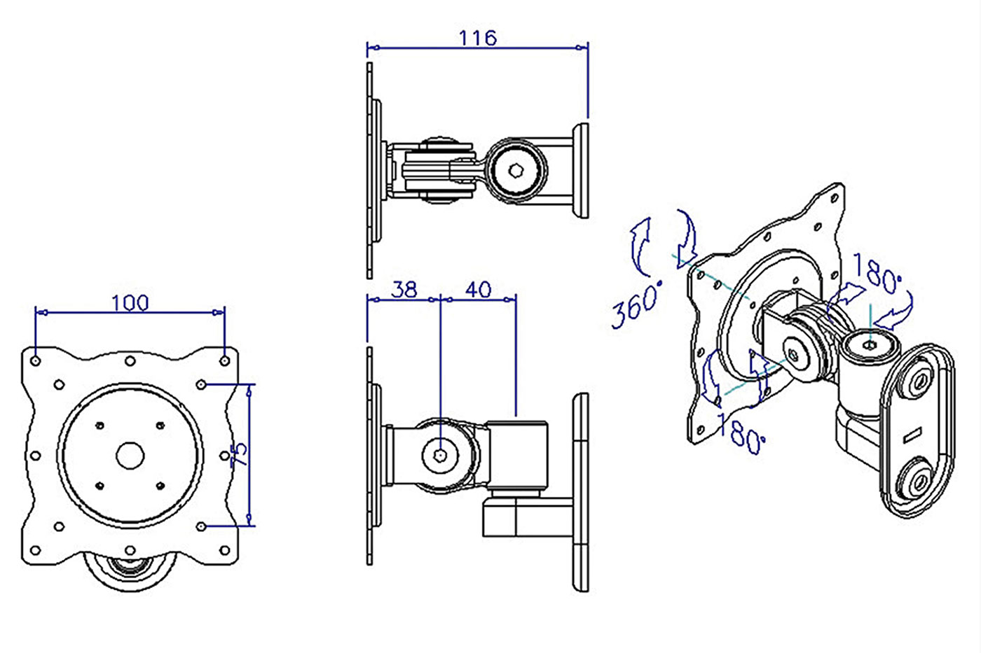 Použití: Vhodný pro montáž plochého displeje na svislou plochu. Jeho 2 klouby a otočná základna dipleje umožňuje dokonalé nastavení displeje v prostoru. Základna ramene se montuje na stěnu. Vhodný pro montáž většiny displejů s VESA 75x75 nebo 100x100.;