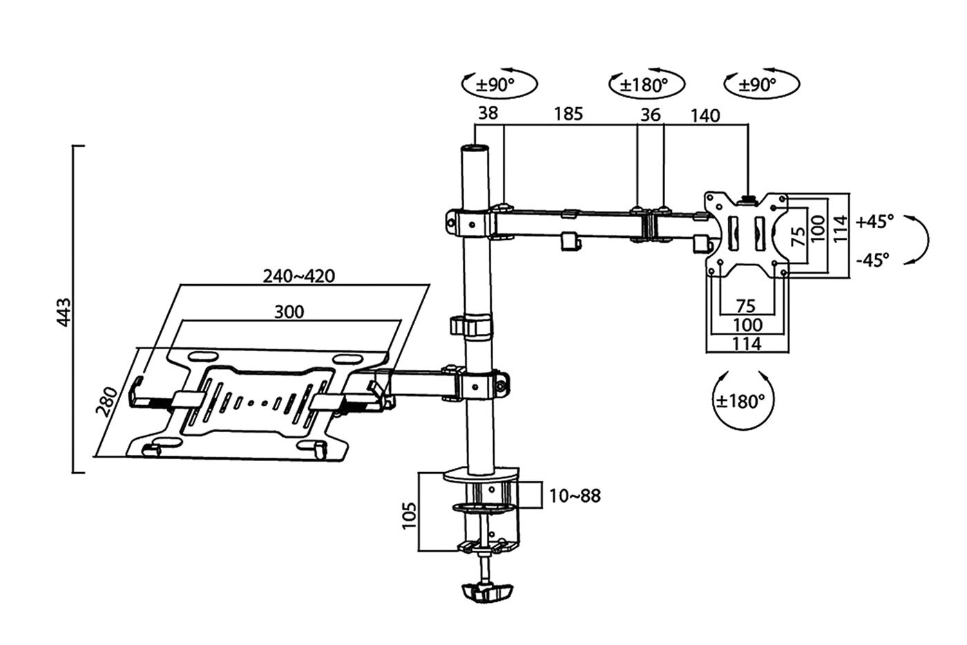 Použití: Jednoduše konfigurovatelné pracovní místo s notebookem a displejem. Oddělená ramena pro notebook a LCD umožňují vysokou variabilitu při nastavení vzájemné pozice. Sestava se skládá ze 2 držáků VESA 75 / 100 a držáku notebooku, který se namontuje na jeden z VESA adaptérů. Bez držáku notebooku lze použít i jako držák pro 2 monitory.;