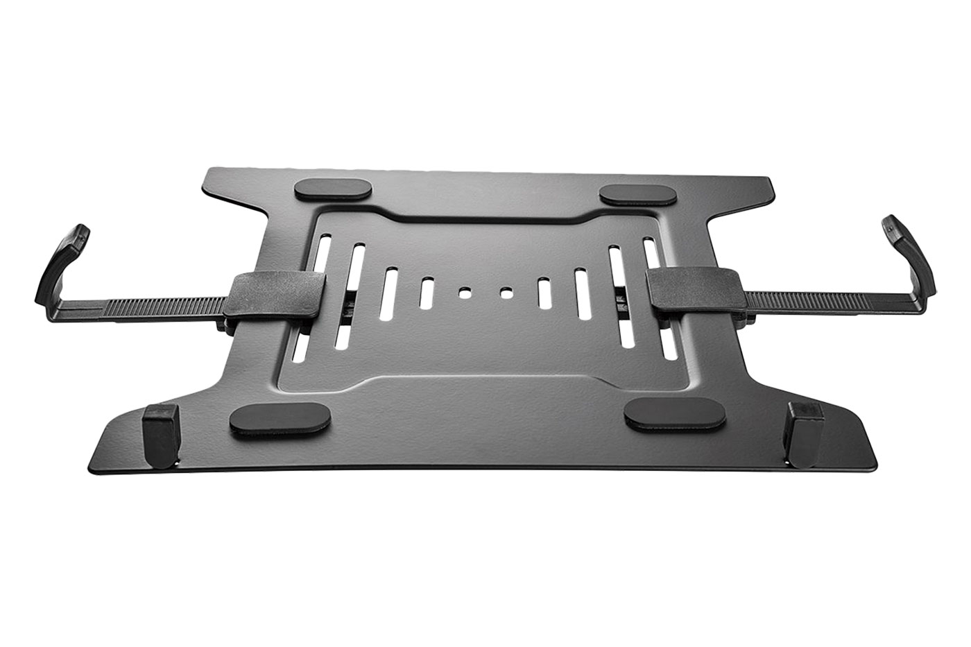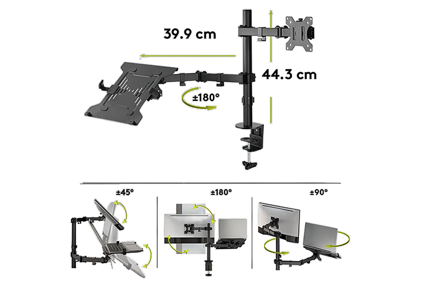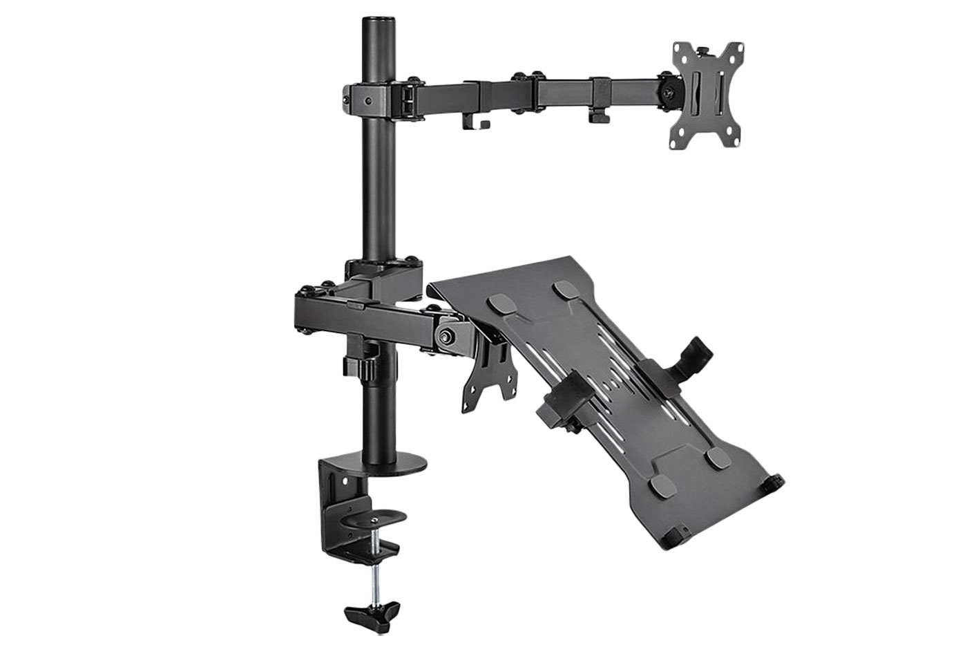 Jednoduše konfigurovatelné pracovní místo s notebookem a displejem. Oddělená ramena pro notebook a LCD umožňují vysokou variabilitu při nastavení vzájemné pozice. Sestava se skládá ze 2 držáků VESA 75 / 100 a držáku notebooku, který se namontuje na jeden z VESA adaptérů. Bez držáku notebooku lze použít i jako držák pro 2 monitory.