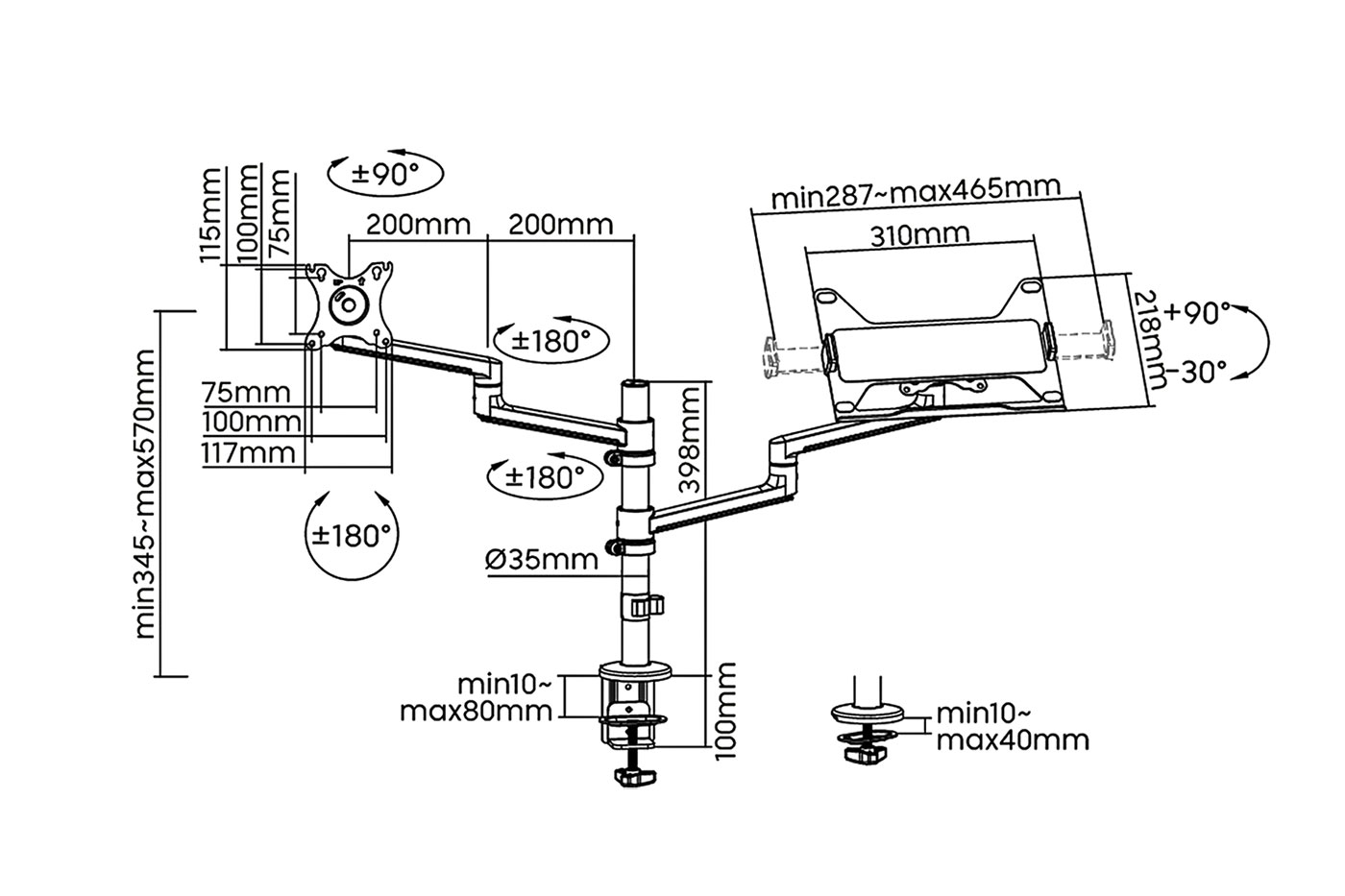 Nastavitelný držák se 2 rameny pro uchycení LCD displeje a notebooku. Montáž na stůl.;