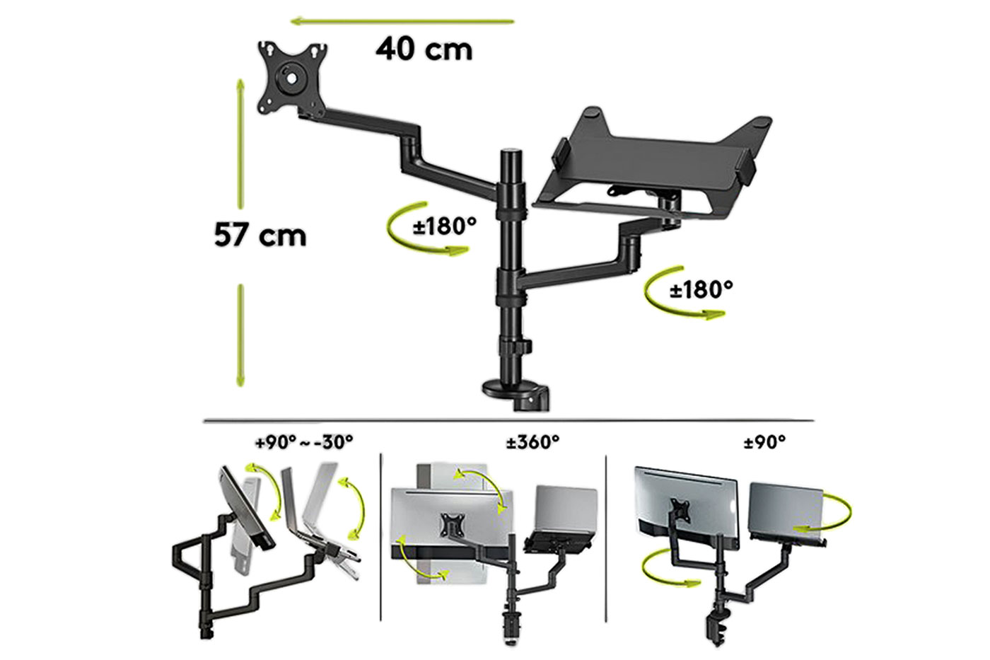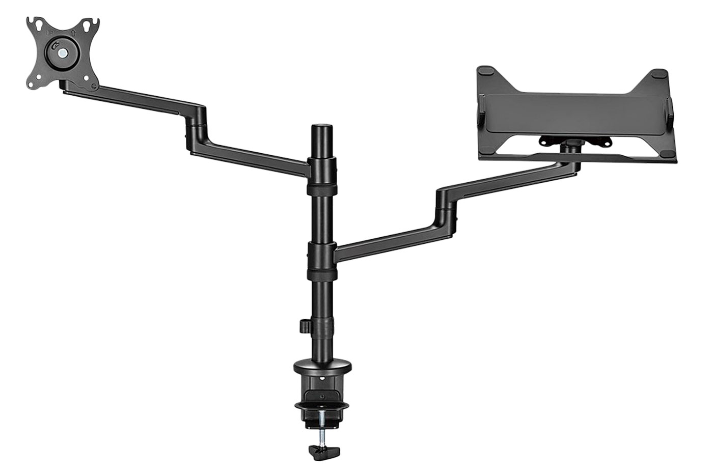 Jednoduše konfigurovatelné pracovní místo s notebookem a displejem. Oddělená ramena pro notebook a LCD umožňují vysokou variabilitu při nastavení vzájemné pozice. Sestava se skládá ze 2 držáků VESA 75 / 100 a držáku notebooku, který se namontuje na jeden z VESA adaptérů. Bez držáku notebooku lze použít i jako držák pro 2 monitory.