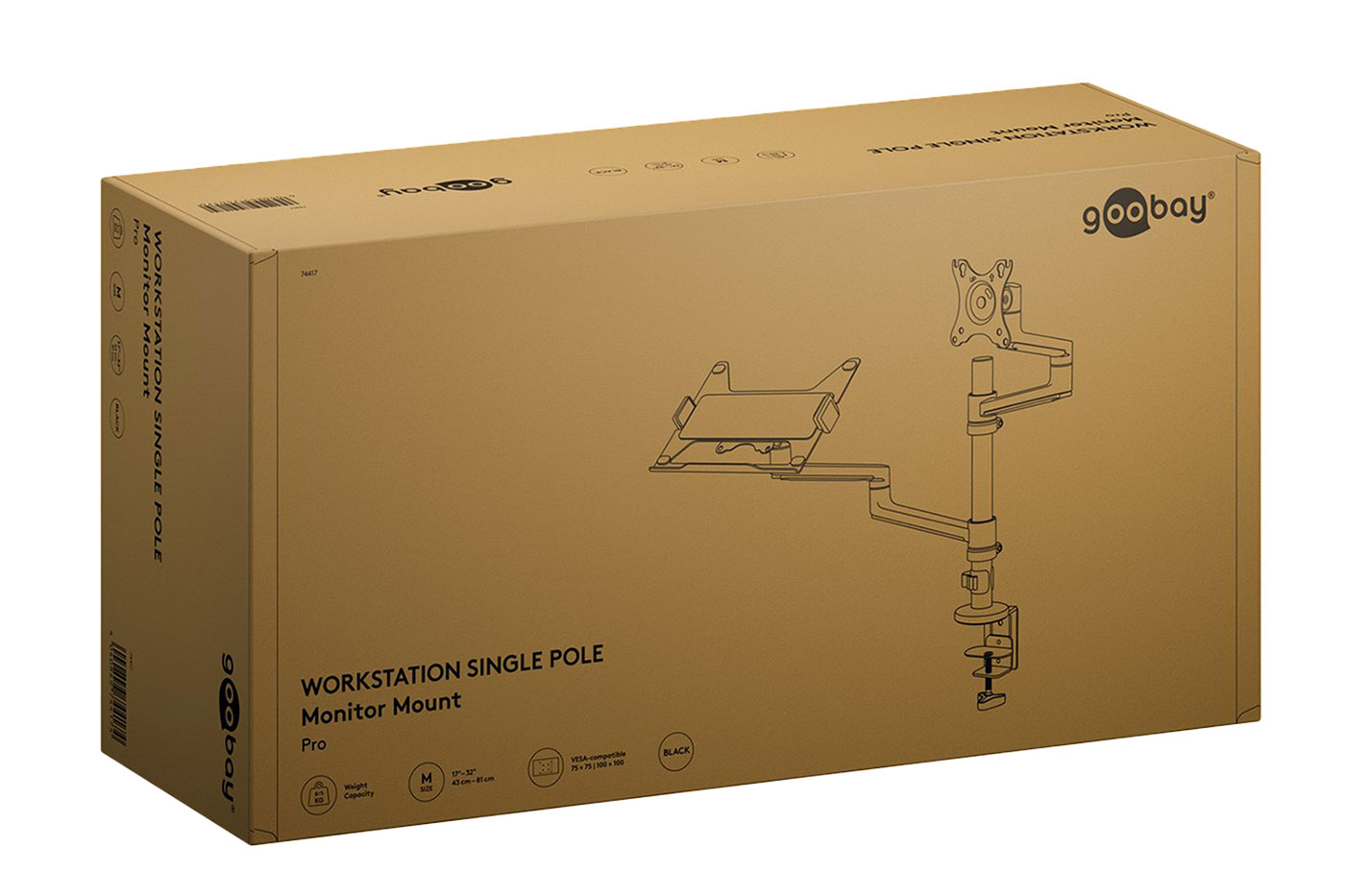 Obsah balení: nosná tyč, 2 ramena s držáky VESA, držák notebooku montovatelný na VESA, inbus klíč, 2x sada pro montáž displeje;