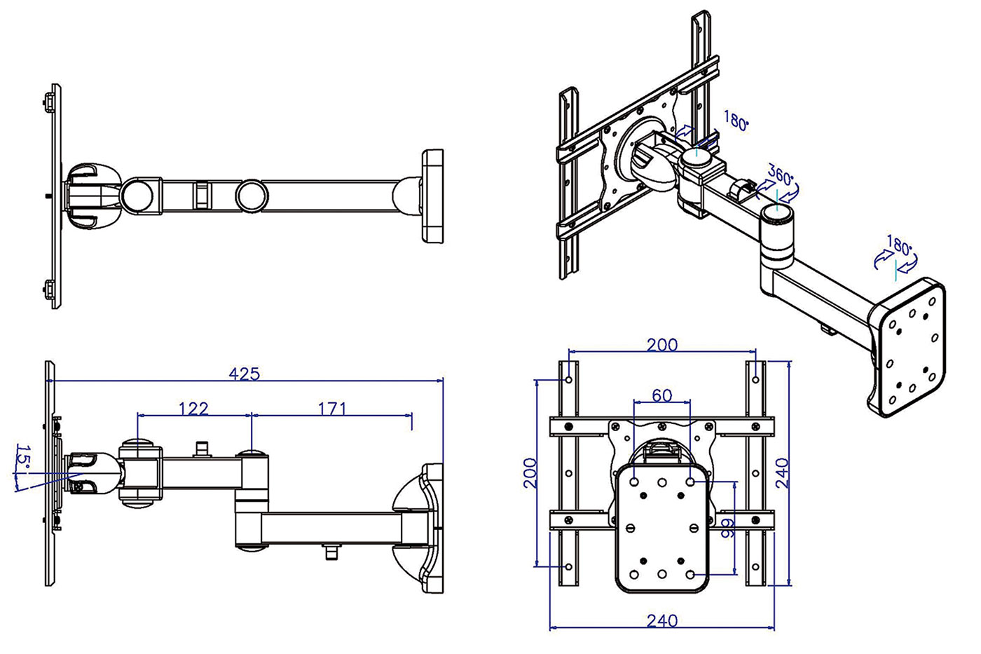 Držák LCD displeje nebo TV s VESA 75 x 75 mm, VESA 100 x 100 mm, VESA 100 x 200 mm nebo VESA 200 x 200 mm, rameno 42,5cm, 4 klouby s montáží na stěnu.;