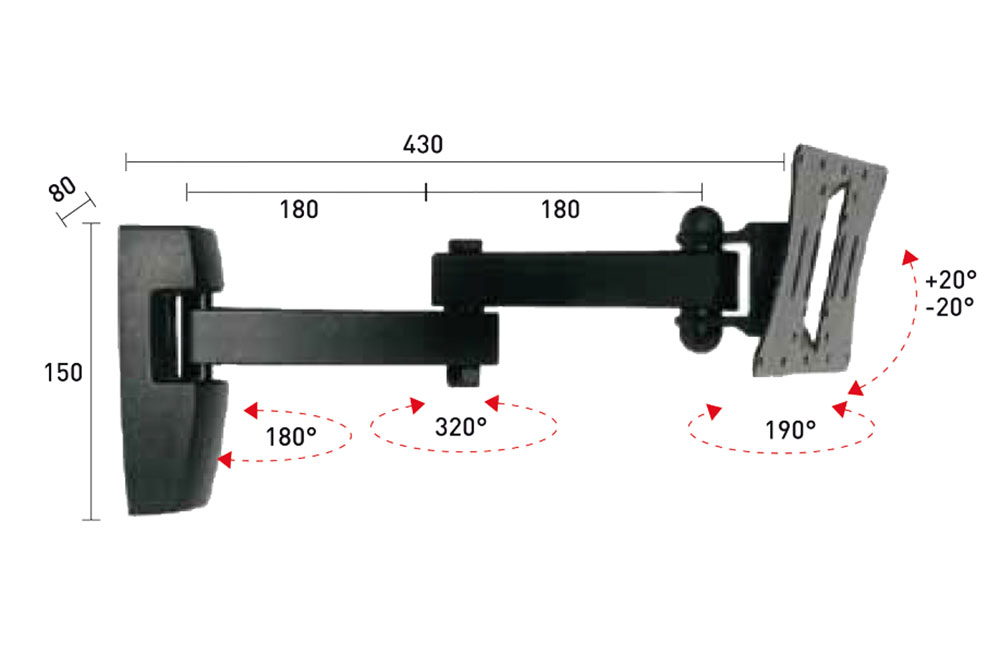 Držák navržený pro montáž standardních plochých televizí a displejů. Díky velkému rozsahu montážních rozměrů pro displeje (VESA 75x75 - VESA 200x100), vyhoví požadavkům na montáž nejrůznějších typů televizí s úhlopříčkou 10 - 32". Jeho 4 klouby umožňují dokonalé nastavení televize v prostoru. Základna ramene se montuje na stěnu.