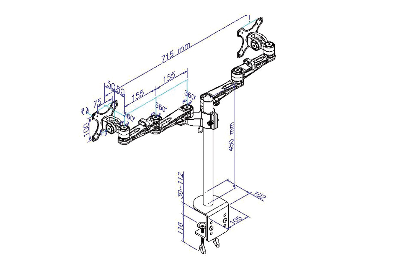 Držák 2 LCD displejů, 2 ramena 48cm, 4 klouby každé rameno. Montáž na stůl.;