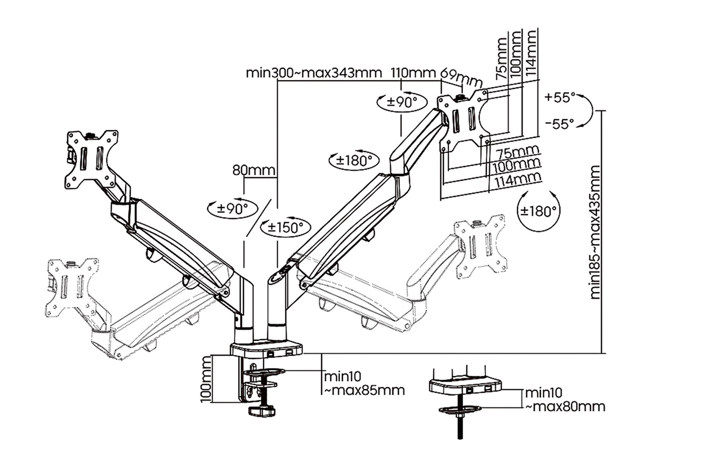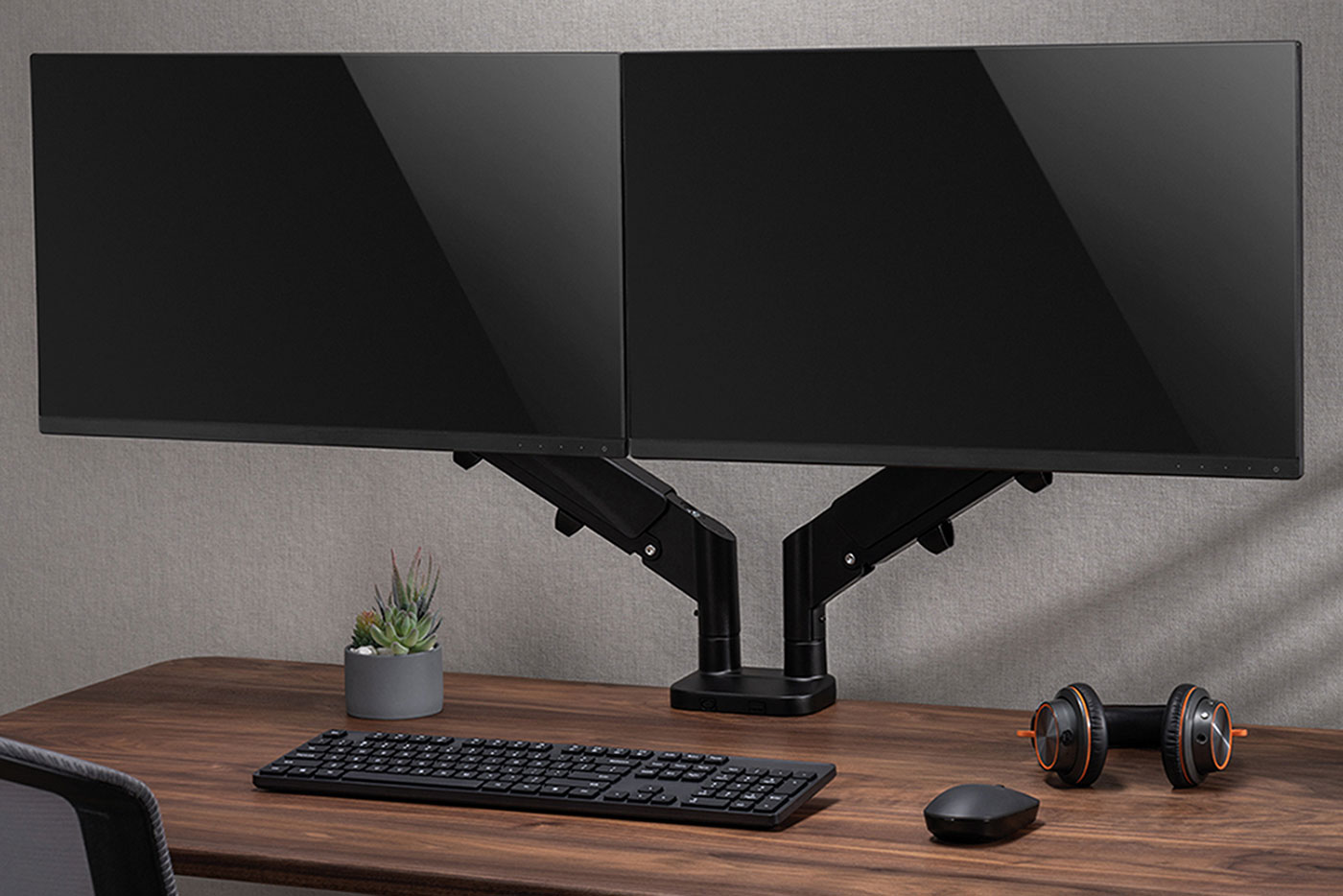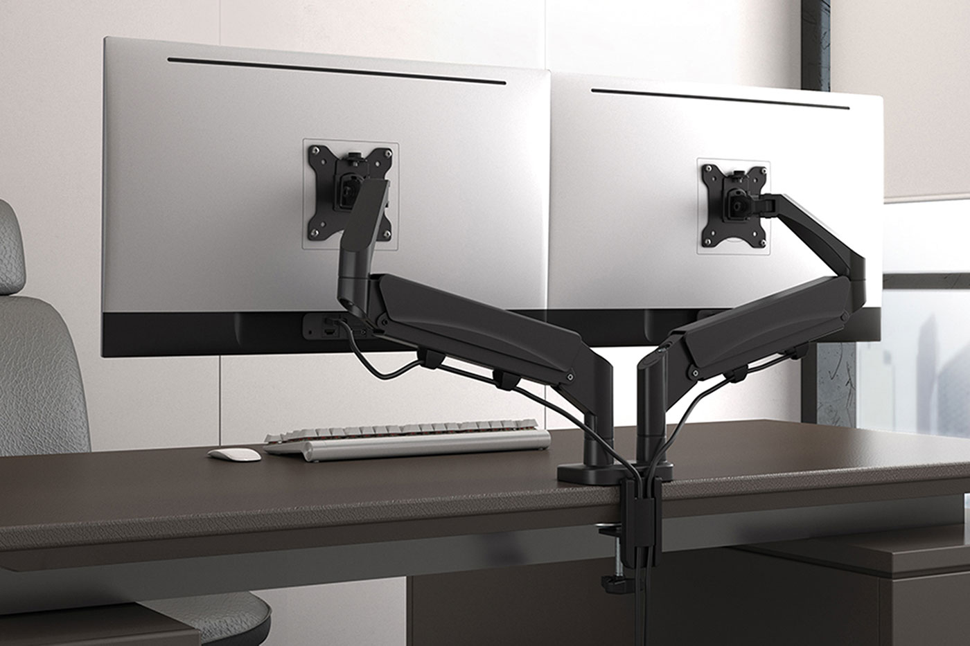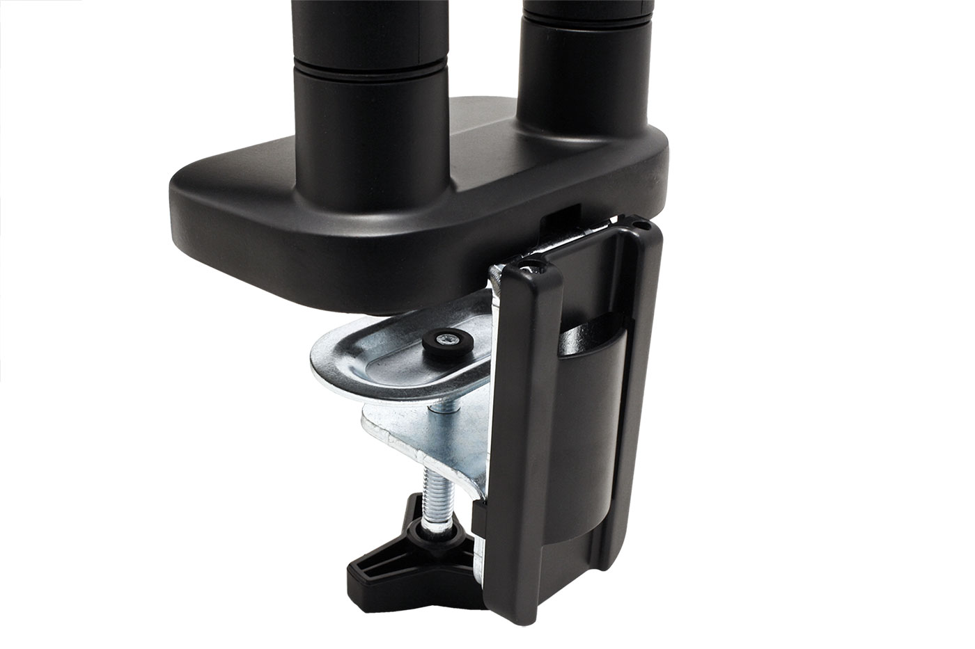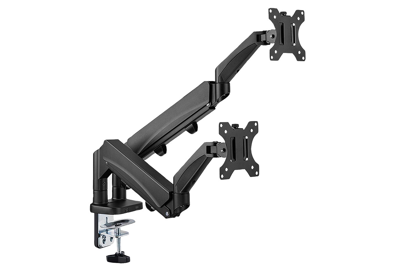 Pro montáž 2 LCD monitorů na stůl. Díky 6 kloubům na každém rameni umožňuje přesné nastavení monitoru v prostoru. Zkrácená koncová část ramena je navržena pro zmenšení nevyužitého prostoru za monitory.
