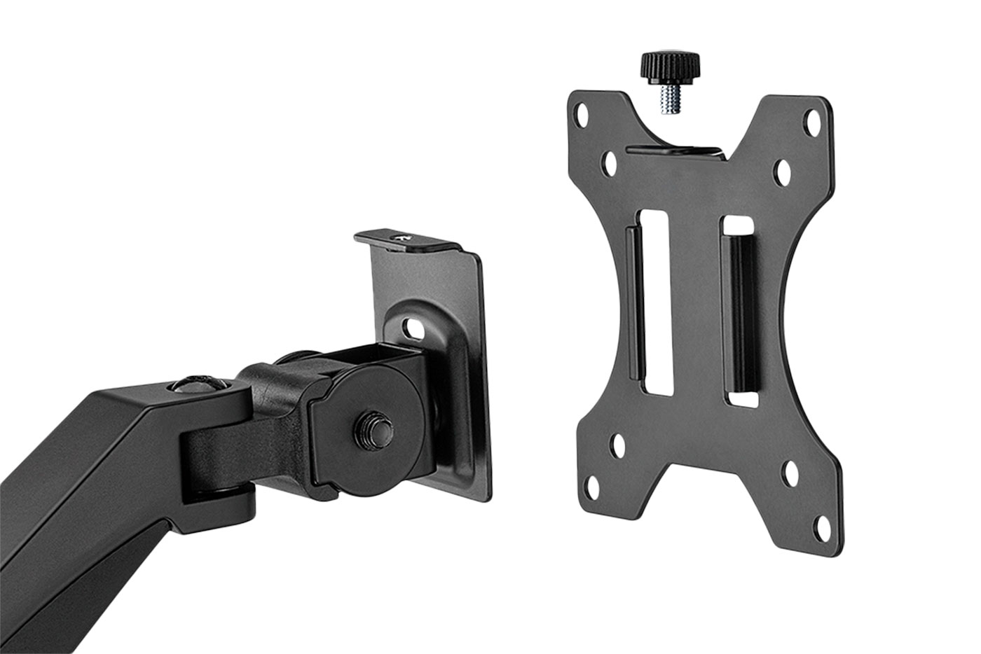 Použití: Pro montáž 2 LCD monitorů na stůl. Díky 6 kloubům na každém rameni umožňuje přesné nastavení monitoru v prostoru. Zkrácená koncová část ramena je navržena pro zmenšení nevyužitého prostoru za monitory.;