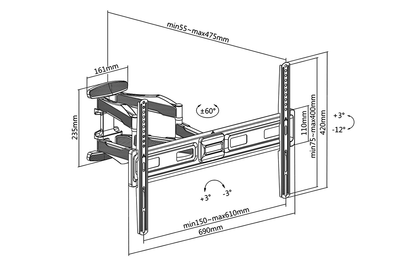 Použití: Pro zavěšení plochého displeje nebo televize o úhlopříčce až 80" (203cm) na stěnu s možností naklápění.;