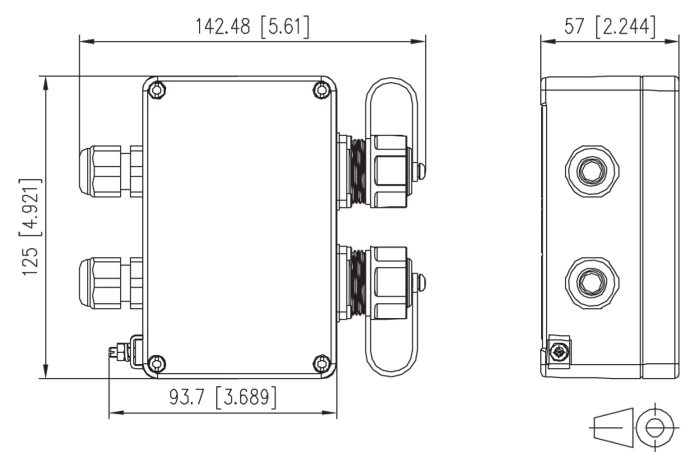 Kovový box se 2 průchodkami určenými pro osazení průmyslovými moduly RJ45, USB nebo optickými konektory. Na protilehlé straně jsou osazeny 2 kabelové průchodky.
