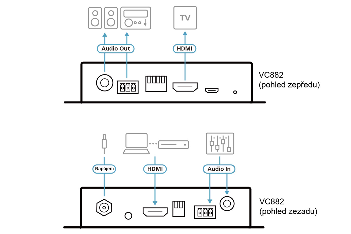 - odbočení audio signálu z výstupu - z výstupního HDMI signálu se odstraní audio kanál a je přesměrován na výstupní analogový výstup a S/PDIF výstup