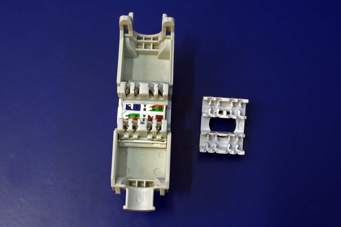 - nařezávání bez nástrojů - zasunutím plastové krytky s kabelem a zaklapnutím bočnic konektoru;
