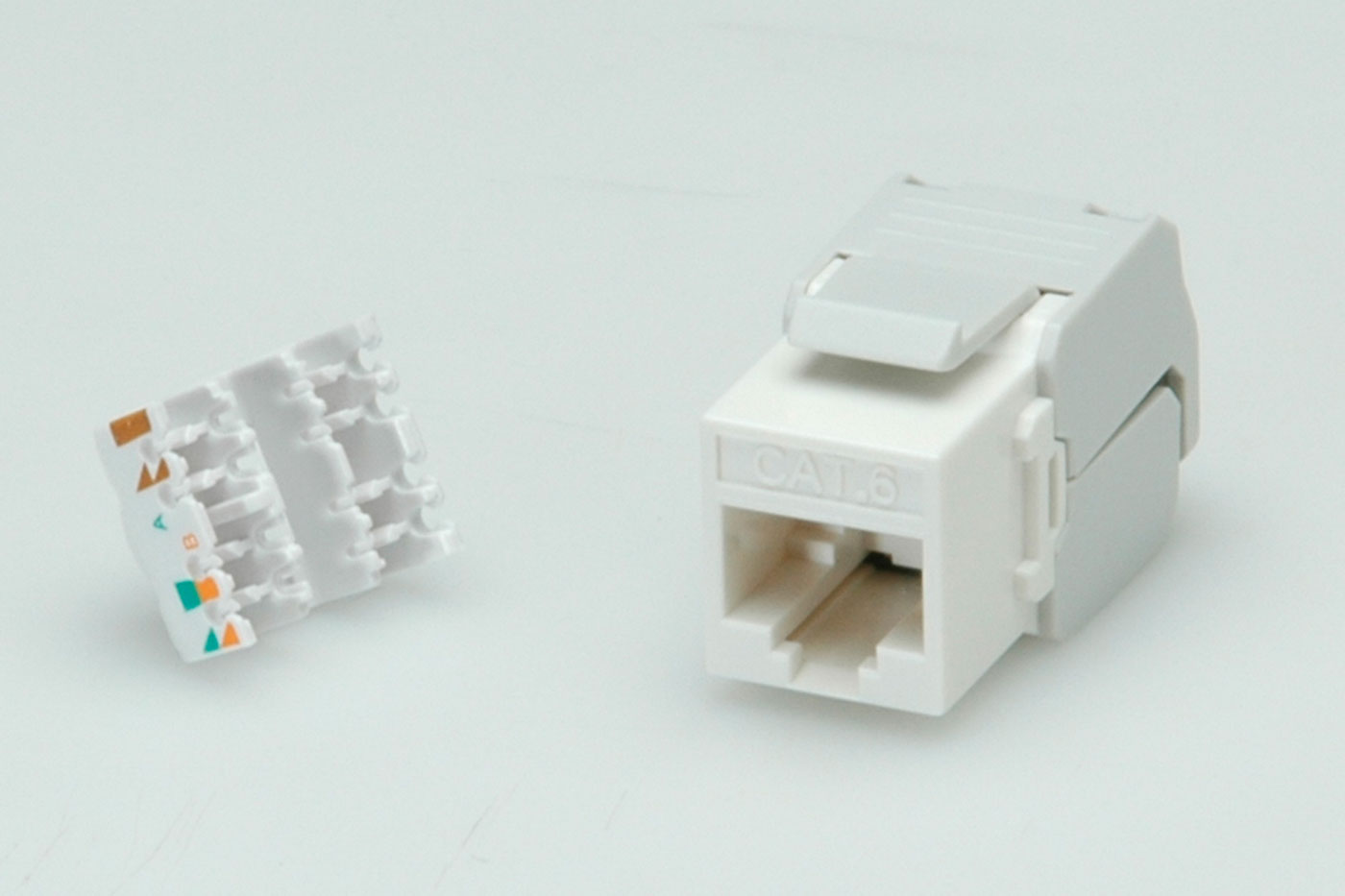 Konektor RJ45 kategorie 6 v provedení pro osazení do panelu (keystone) s nařezávacími kontakty a vývodem kabelu v pozici 180° proti konektoru.;