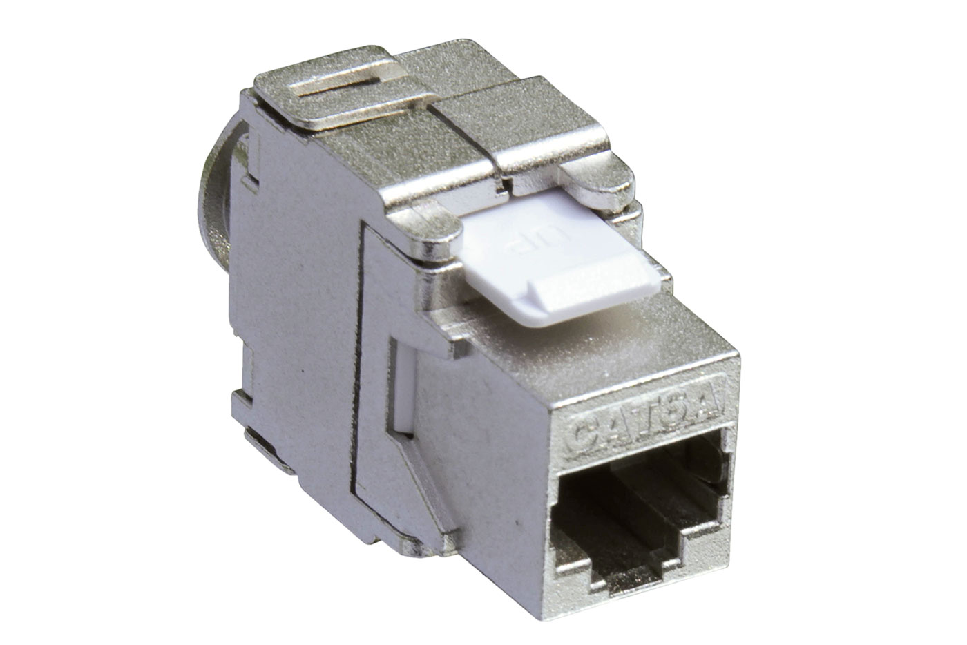 Konektor RJ45 kategorie 6a v provedení pro osazení do panelu (keystone) s nařezávacími kontakty a vývodem kabelu v pozici 180° proti konektoru.;