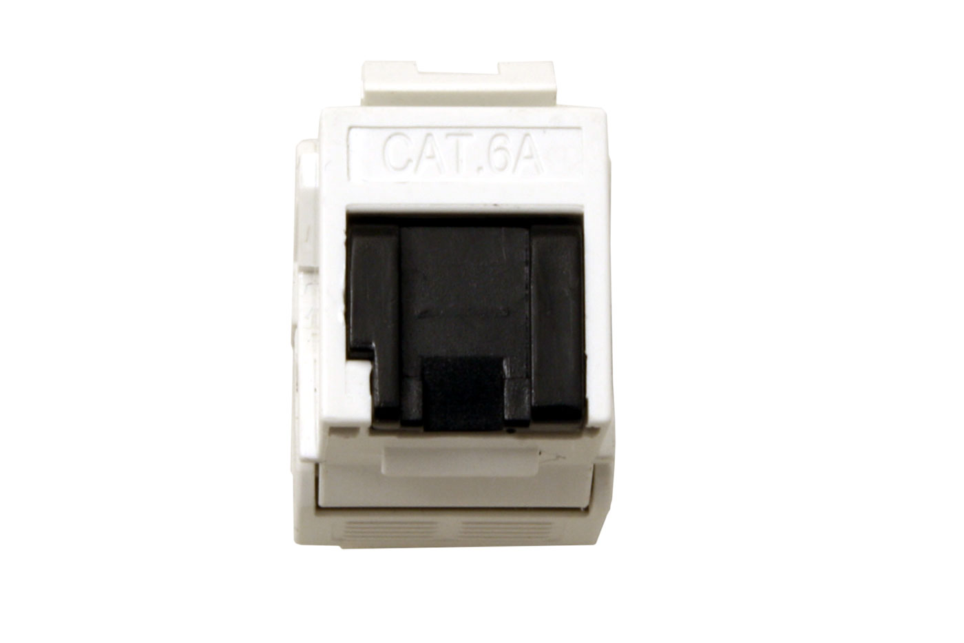 Konektor RJ45 kategorie 6a v provedení pro osazení do panelu (keystone) s nařezávacími kontakty a vývodem kabelu v pozici 180° proti konektoru.;