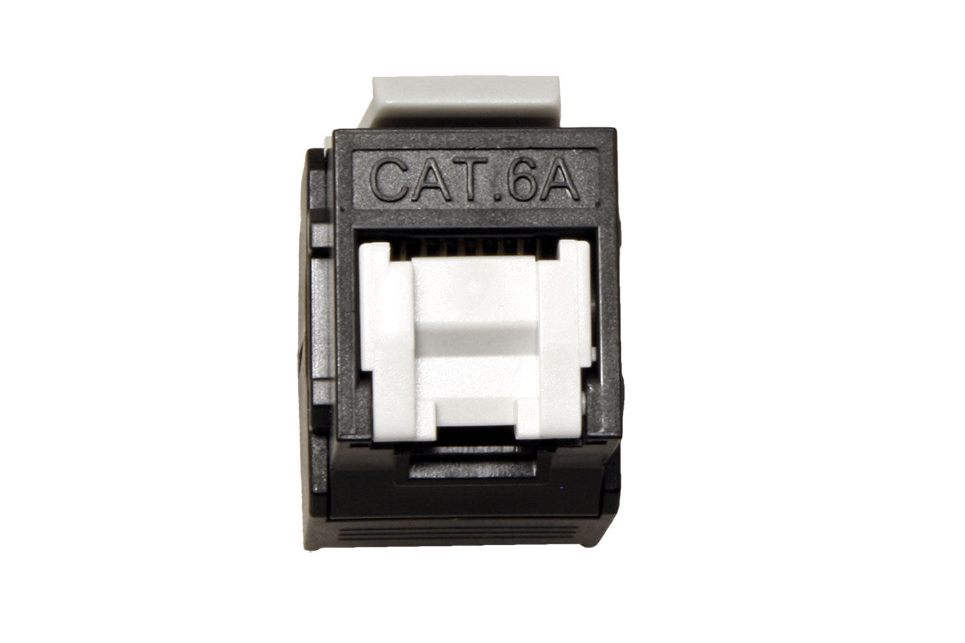 Konektor RJ45 kategorie 6a v provedení pro osazení do panelu (keystone) s nařezávacími kontakty a vývodem kabelu v pozici 180° proti konektoru.;
