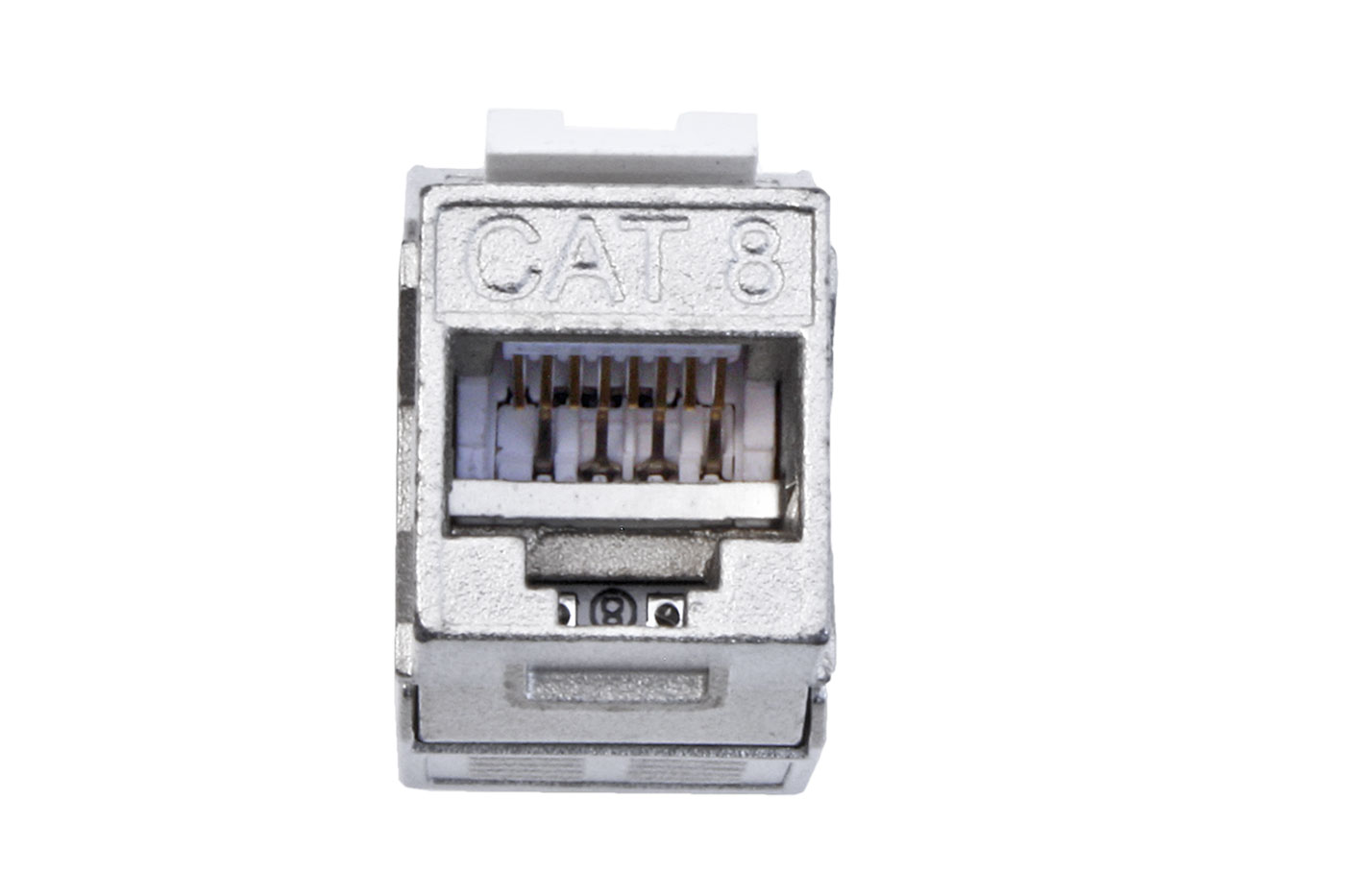 Konektor RJ45 kategorie 8.1 v provedení pro osazení do panelu (keystone) s nařezávacími kontakty a vývodem kabelu v pozici 180° proti konektoru.;