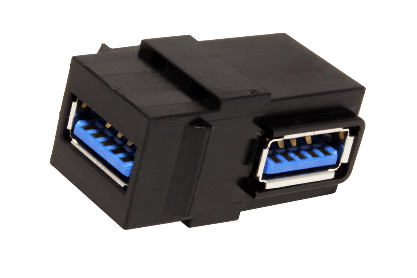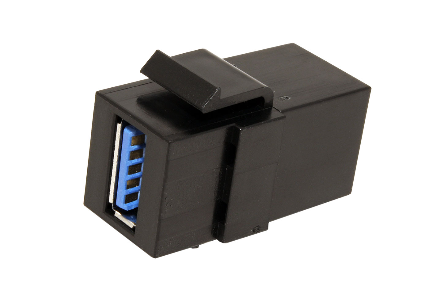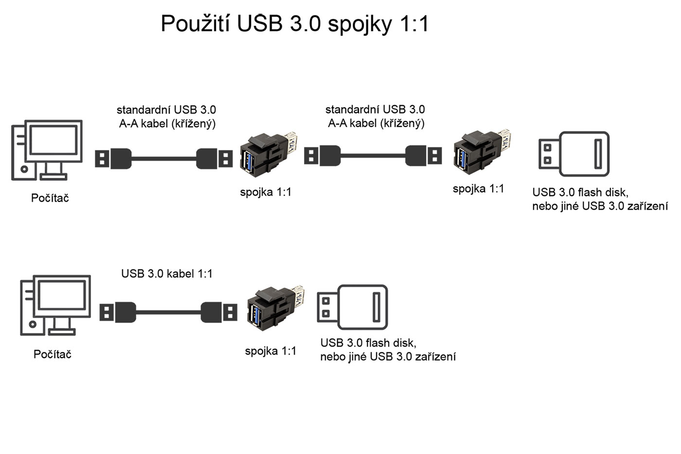 Upozornění: Spojka je zapojena 1:1 a proto s použitím standardního USB 3.0 A-A kabelu nefunguje USB 3.0 přenos (pouze USB 2.0). S použitím standardních (křížených) USB 3.0 A-A kabelů musí být v propojení zapojeny 2 tyto spojky (například při propojení 2 spojek v různých panelech). Při použití jedné spojky je nutno použít USB 3.0 A-A kabel 1:1.;