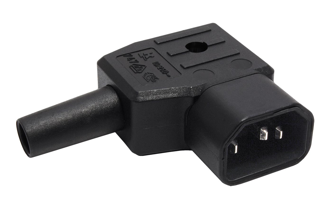 Síťový konektor kabelový pro PC 230V, samec (IEC320/C14). Lomený o 90°;