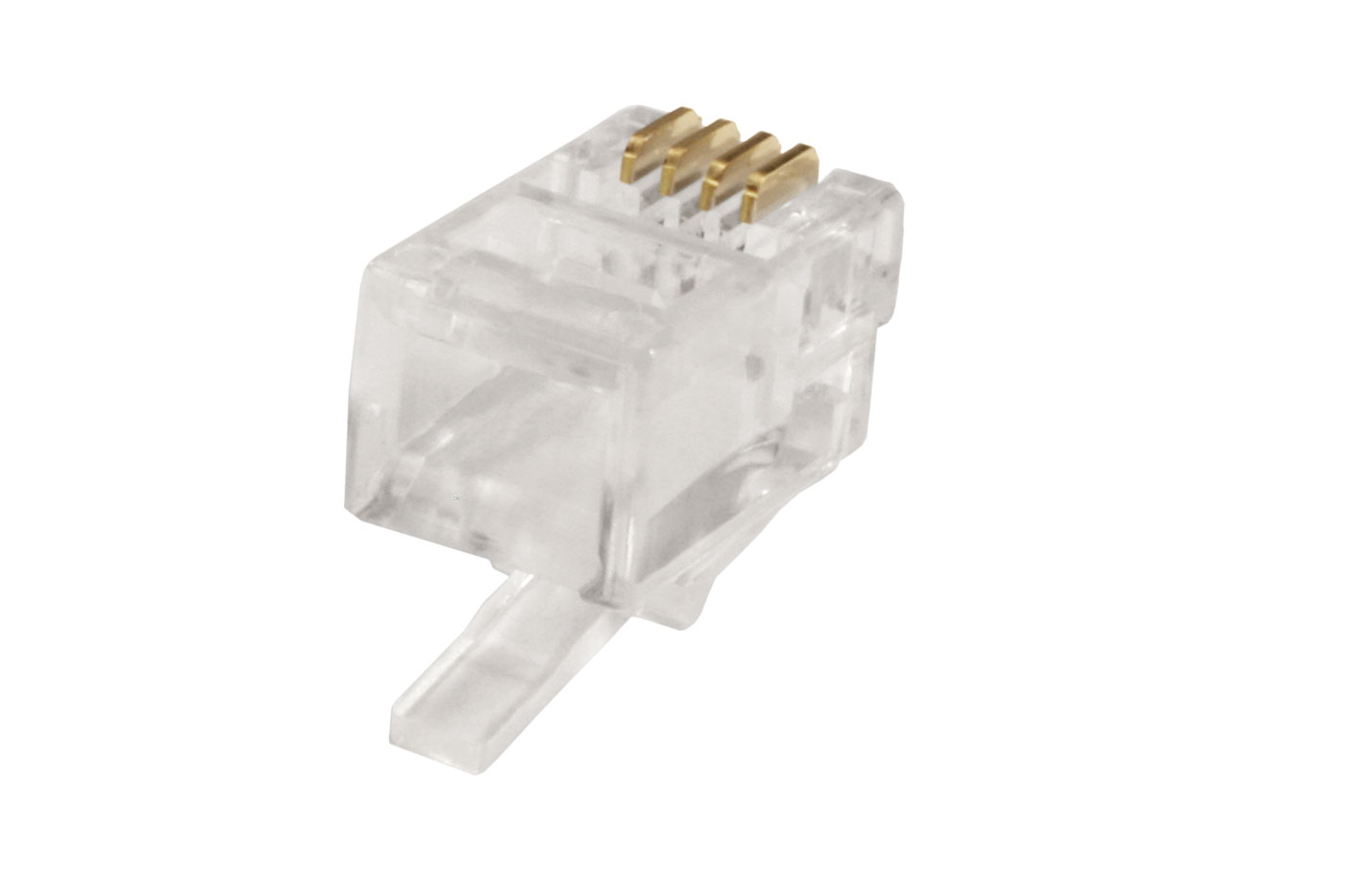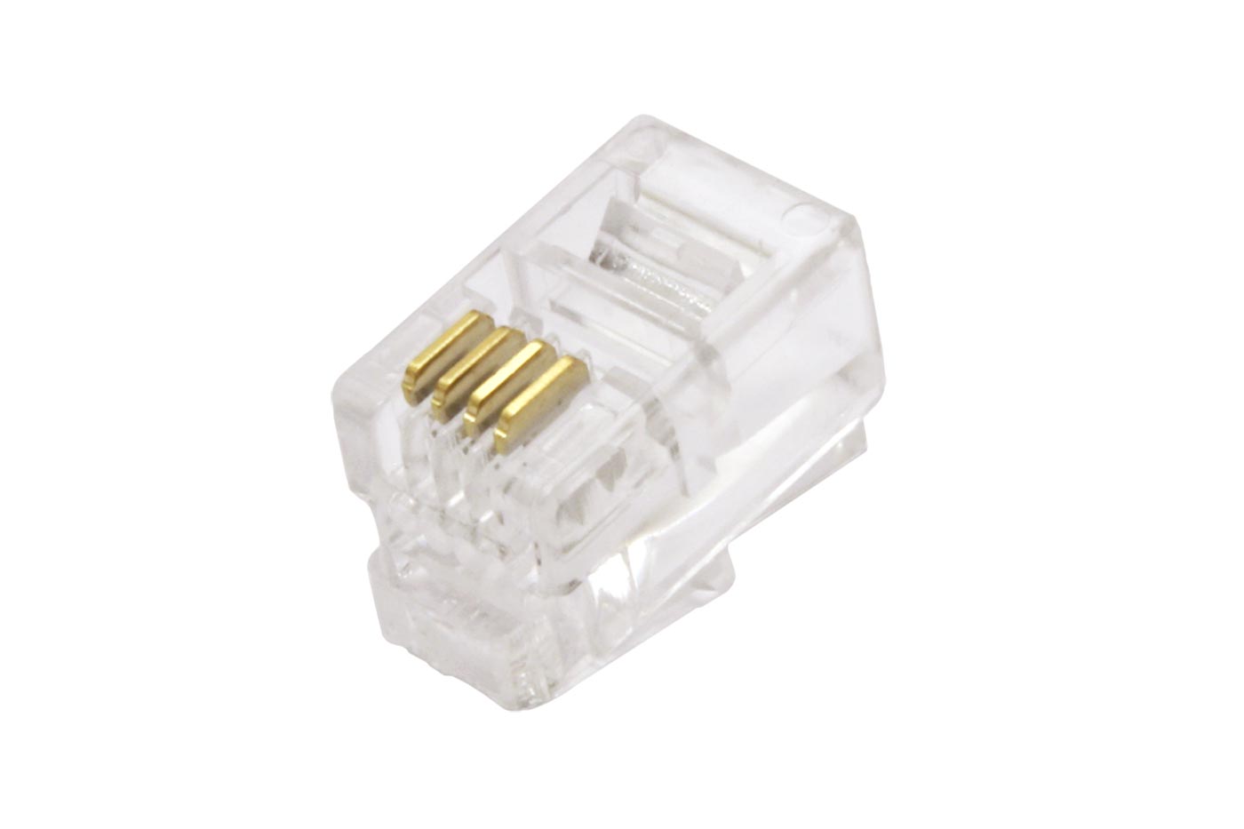 Konektor určený k nalisování (krimpování) na plochý telefonní kabel. 4 pozice, všechny osazeny kontakty.