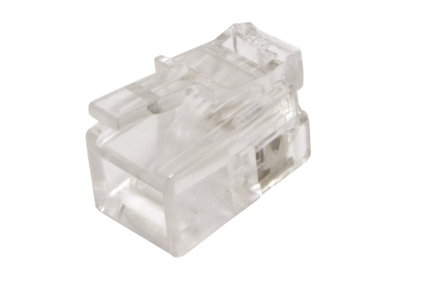 Konektor určený k nalisování (krimpování) na plochý telefonní kabel. 4 pozice, všechny osazeny kontakty.;