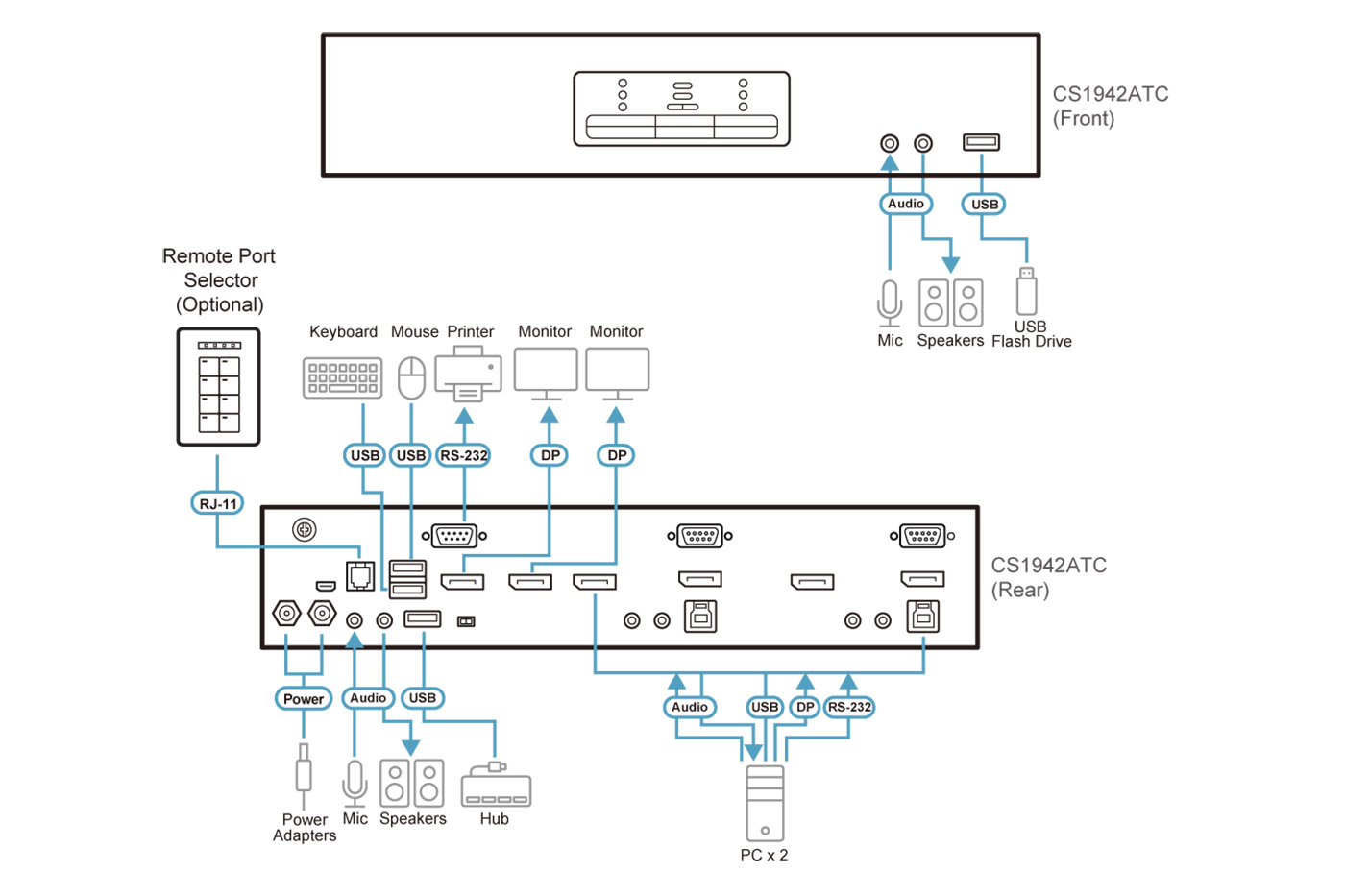 Přepínač pro ovládání 2 počítačů (klávesnice, 2x video DP, myš, audio, USB) z jednoho stanoviště (2x DP monitor + USB a audio) určený předevší speciálně pro řízení leteckého provozu (ATC). Možnost sdílet USB 5Gb/s (USB 3.2 Gen.1 / USB 3.0) zařízení.
