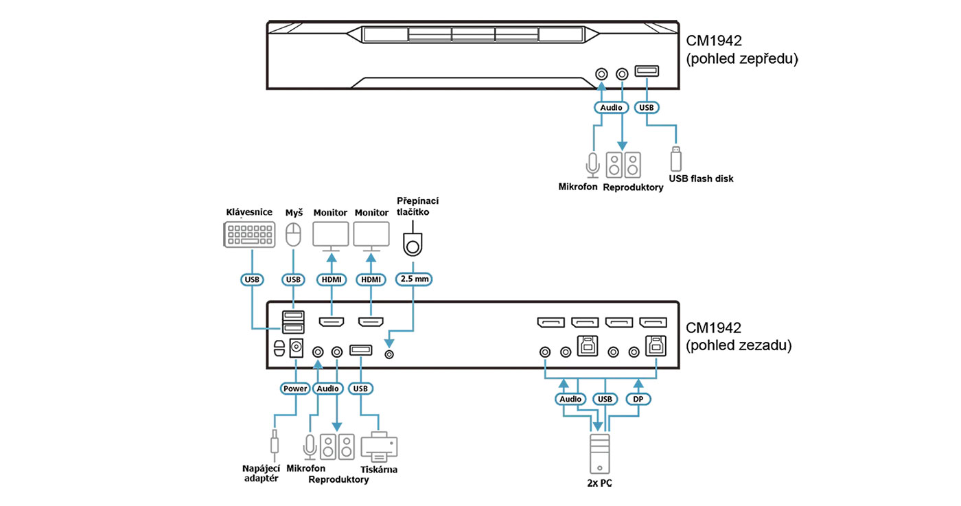 - Možnost přepínání KVM, USB zařízení a audia odděleně