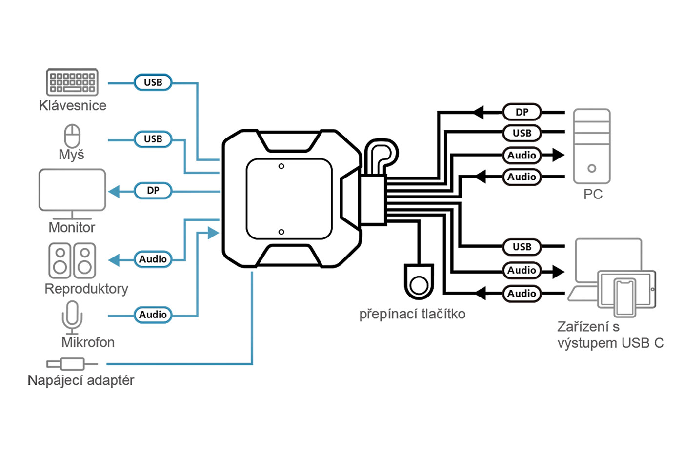 Použití: Pro ovládání 2 počítačů pomocí jedné konzole. DisplayPort je do jednoho počítače připojen přes DP konektor, do druhého přes USB C konektor;