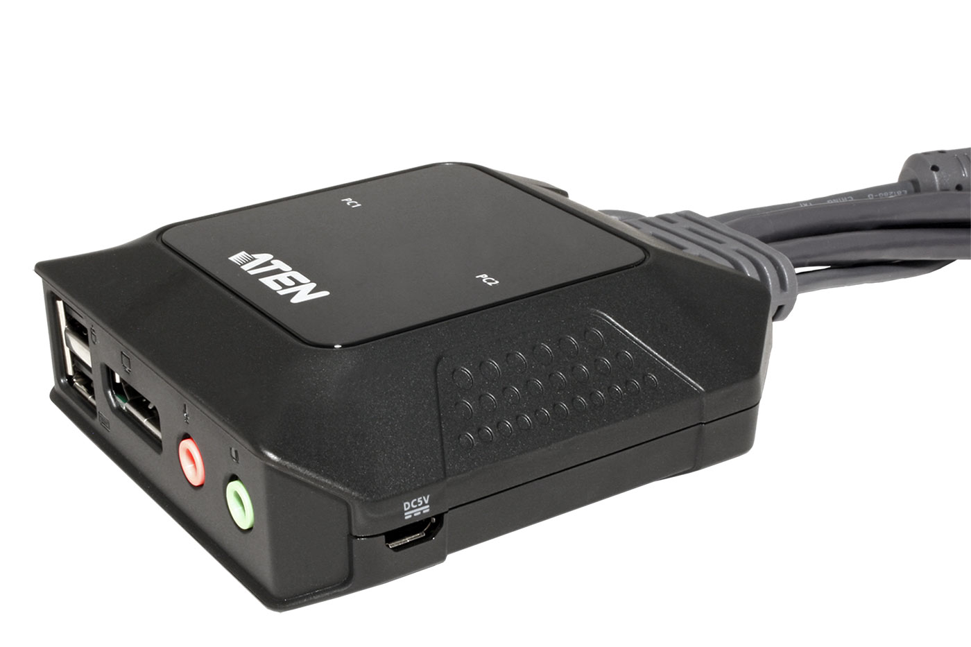 KVM přepínač pro 2 počítače (USB klávesnice, DisplayPort video, USB myš, audio). Klávesnice a myš jsou do počítačů připojeny přes USB port. Kompaktní provedení s integrovanými kabely. Počítače je možno startovat bez nutnosti přepnutí.;