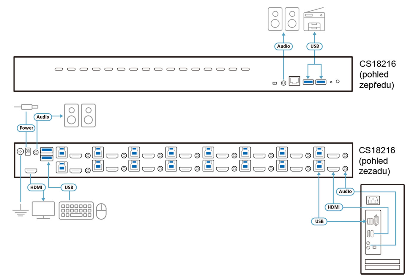 Přepínač pro ovládání 16 počítačů (klávesnice, video, myš, audio) z jednoho stanoviště (HDMI + USB). Možnost sdílet USB 5Gb/s (USB 3.2 Gen.1 / USB 3.0) zařízení.