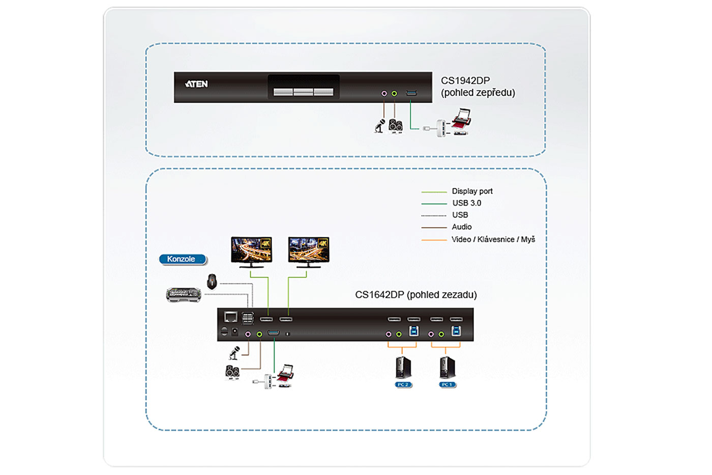- Možnost přepínání KVM, USB zařízení a audia odděleně