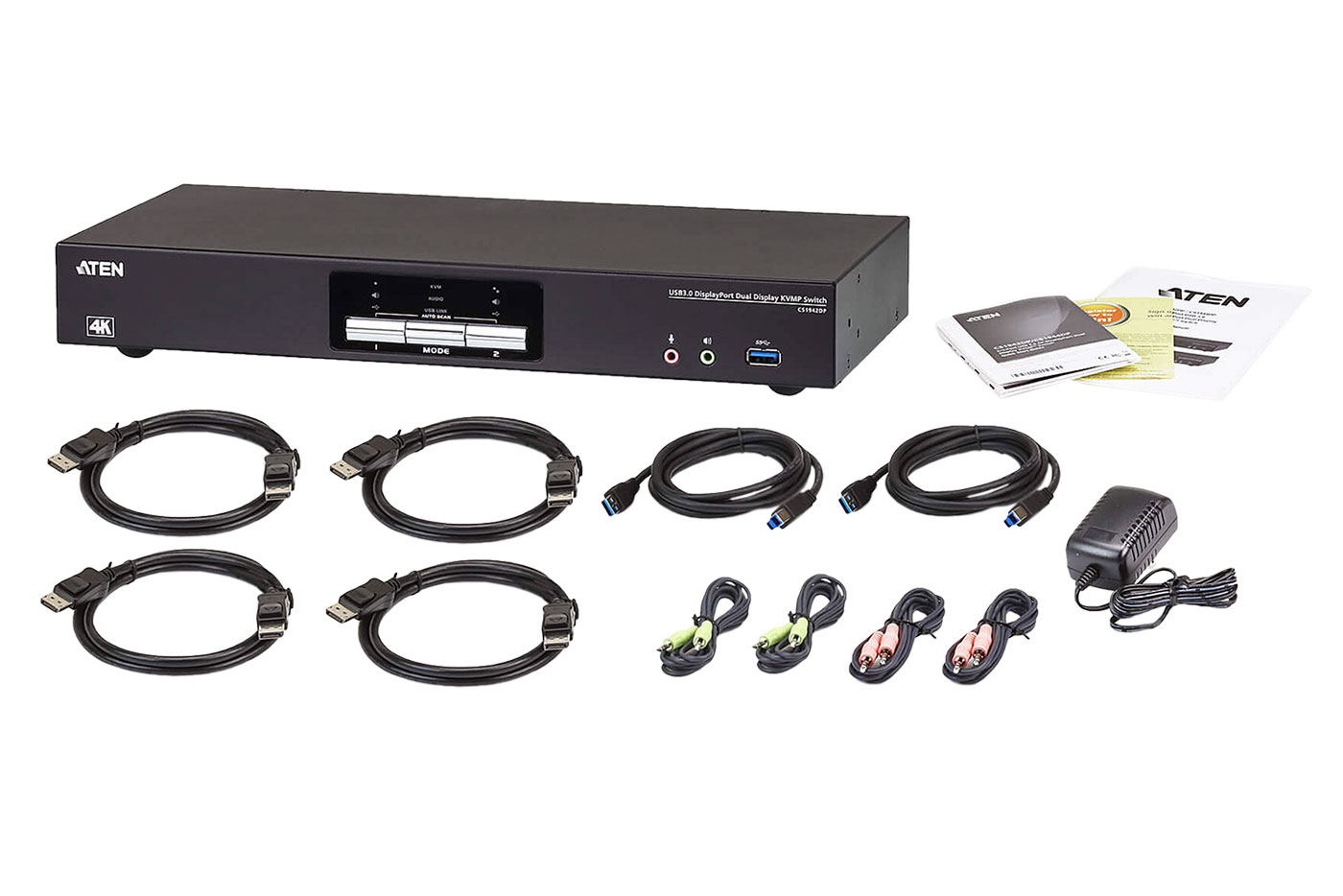 Obsah balení: přepínač, 4x kabel DP(M)- DP(M) 1,3m, 4x kabel stereo jack3,5M - stereo jack3,5M 1,8m, 2x kabel USB30 A(M) - USB30 B(M) 1,8m, napájecí zdroj 12V/3,33A, napájecí kabel zdroje;