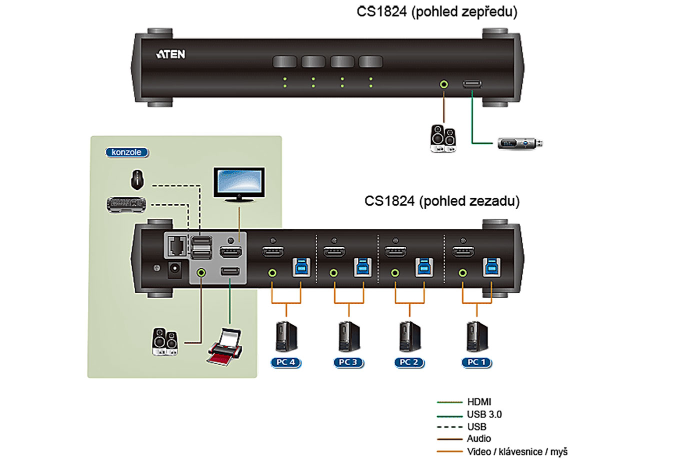 Aten KVM přepínač (USB klávesnice a myš, HDMI) 4:1 USB + USB 3.0 hub (CS1824)