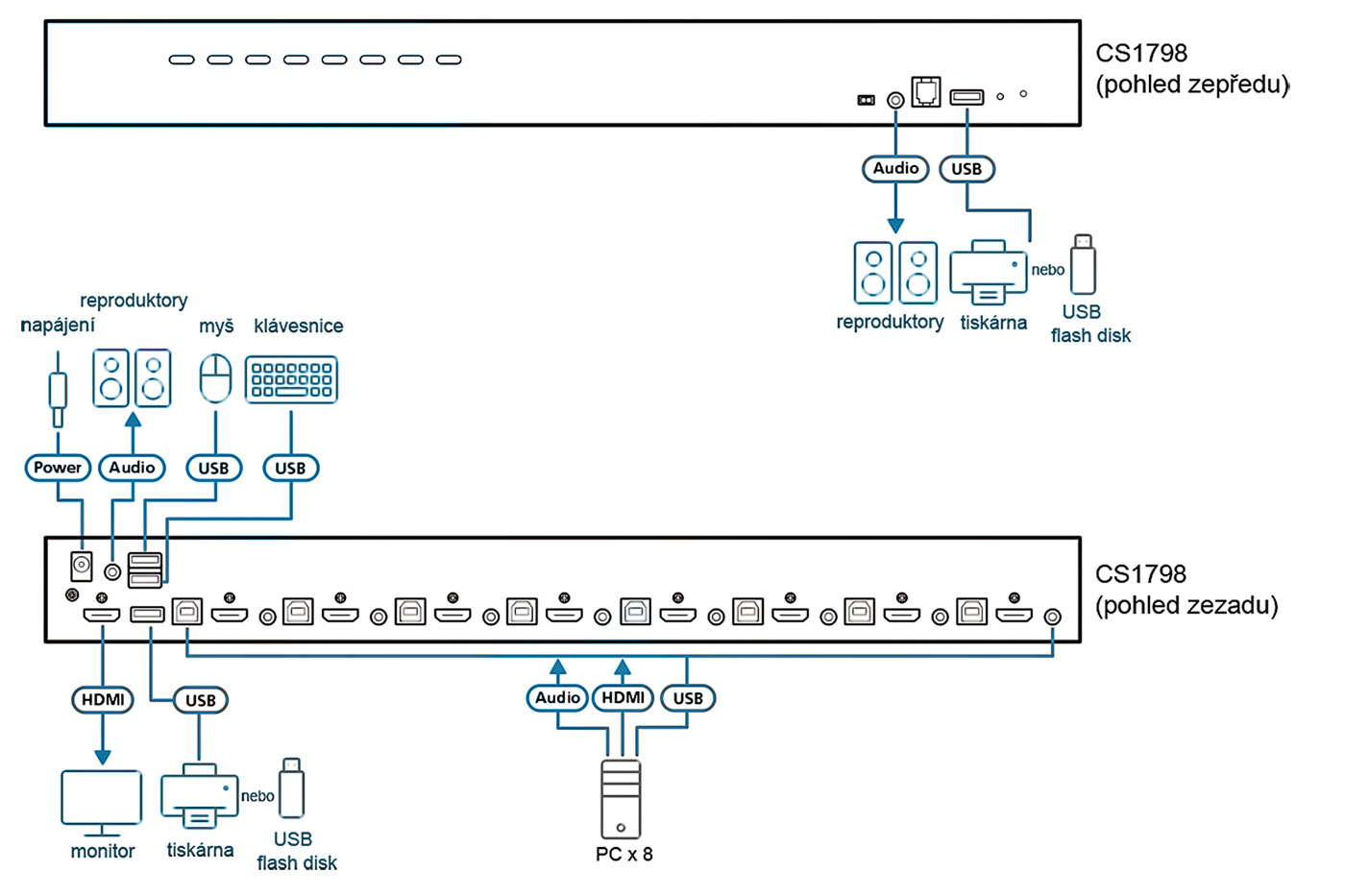 Použití: Máte více počítačů a nechcete mít na stole několik monitorů, klávesnic a myší pro každý počítač zvlášť? Ovládejte všechny počítače z jednoho místa! K tomuto přepínači můžete připojit až 8 počítačů s grafickým výstupem HDMI a ovládáním přes USB (klávesnice a myš). K připojeným počítačům je možno také sdílet další USB zařízení (například tiskárnu…). Jednoduše připojte HDMI monitor, USB klávesnici, myš a reproduktory, a mějte svoje počítače pod kontrolou.;